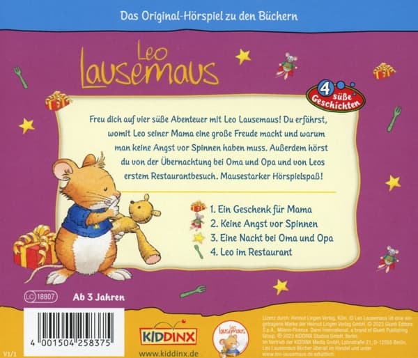| 18 | | Wietzorek, L. / Gawlich, C. / Lelle, T. / Reidies, D. / Betz, L. / +++ | Leo Lausemaus: Ein Geschenk für Mama / Keine Angst vor Spinnen / Eine Nacht bei Oma und Opa / Leo im Restaurant | 00:01:20 |
