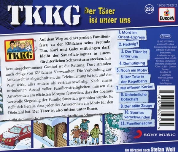 Ein neuer Fall für TKKG in der Folge 226 „Der Täter ist unter uns“ verspricht spannende Unterhaltung für die Ohren. In einer verschneiten Winterlandschaft müssen die vier Freunde einen kniffligen Fall lösen.