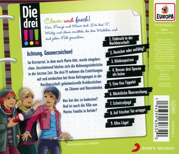 Als die drei Freundinnen herausfinden, dass es sich um Gaunerzinken handelt, mit denen Einbrecher Häuser ausspionieren, beginnt ein Wettlauf gegen die Zeit. Die Mädchen müssen die Botschaften entschlüsseln, um die Täter zu überführen, bevor es zu spät ist. Ein fesselndes Hörerlebnis für alle jungen Spürnasen.
