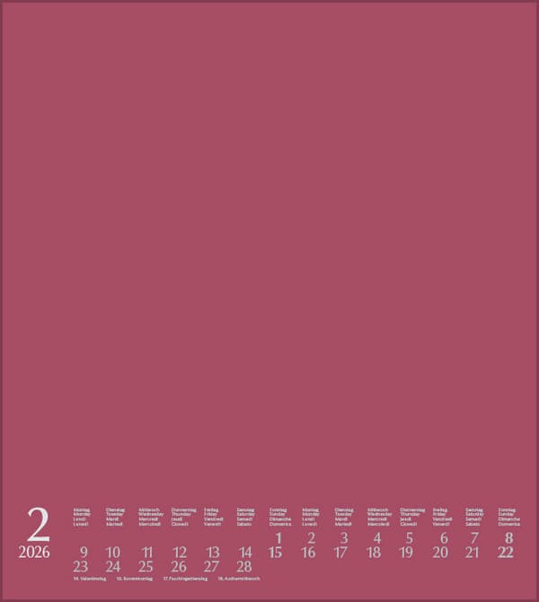 Produktmerkmale • Format: 21,5 x 24 cm, bordeaux, sehr stabile Rückwand, durchgefärbtes FSC Papier • Edler, extra starker Bastelkarton • Maximales Bildformat: Quer 20 x 15 cm, Hoch 13 x 18 cm • Beschreibbar und beklebbar, ohne dass etwas durchscheint • Mehrsprachiges Kalendarium mit Feiertagen für Deutschland, Österreich und Schweiz Hochwertiger Kalender zum Selbstgestalten mit dickem, bordeaux-rotem Papier und Folienprägung Individuelle Gestaltung Lassen Sie Ihrer Kreativität freien Lauf und gestalten Sie Ihren persönlichen DIY-Kalender. Mit 12 Kalenderblättern und einem Titelblatt bietet er zahlreiche Möglichkeiten Ihren eigenen Wandkalender individuell zu gestalten. Kreative Geschenkidee Ob zu Weihnachten, zum Geburtstag, Muttertag oder Vatertag - der Kalender eignet sich perfekt als persönliches Geschenk für jeden Anlass. Photos, Collagen, witzige Sprüche oder Zeichnungen - Ihrer Fantasie sind bei der Gestaltung keine Grenzen gesetzt. Dekorativer Wandkalender Jeden Monat schmückt der Kalender mit Monatsansicht Küchen-, Schlafzimmer- oder Arbeitszimmerwände mit einer anderen schön verzierten Seite. Somit wird der selbst gestaltete Kalender zu einem ganz besonderen Wandschmuck