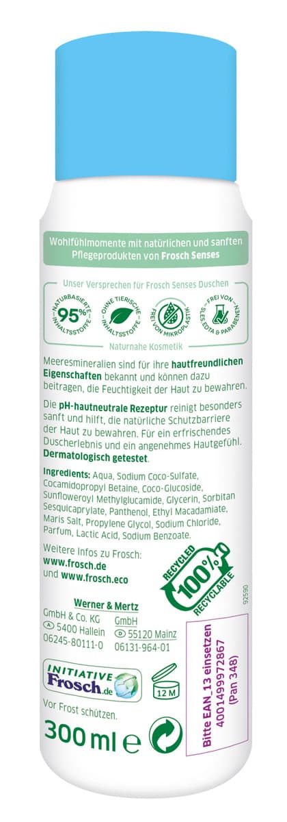 Die Frosch Senses 2in1 Meeresmineralien Sensitiv-Dusche & Shampoo reinigt sanft Haut und Haar und sorgt beim Duschen für ein angenehm zartes Hautgefühl. Die besonders sensitive und 5,5 pH-hautneutrale Pflegeformel mit ausgewählten Inhaltsstoffen Naturnaher Kosmetik ist frei von Farbstoffen, SLES, EDTA, Parabenen, tierischen Inhaltsstoffen und Mikroplastik. Die sehr gute Hautverträglichkeit ist dermatologisch bestätigt. Die Flasche besteht zu 100% aus Altplastik aus dem Gelben Sack/Tonne und ist zu 100% recycelbar.