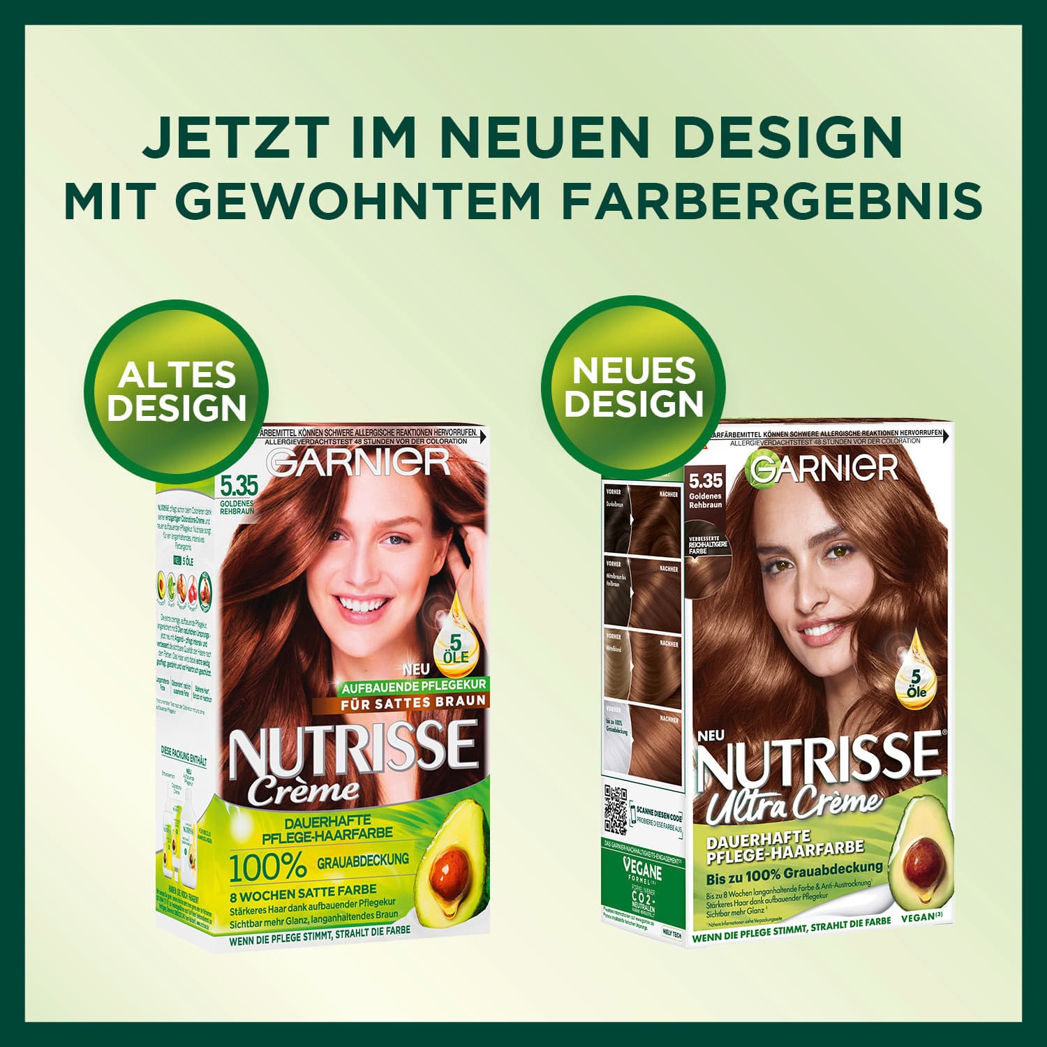 Garnier Nutrisse Creme verleiht dem Haar seidig strahlenden Glanz. Sogar graue Haare werden zu 100 % abgedeckt. Das Ergebnis ist eine Haarfarbe mit einem harmonischen Farbverlauf, das 8 Wochen lang farbintensiv strahlt.Besonders angenehm ist die einfache Anwendung der Coloration. Dank der Creme-Textur tropft sie nicht und lässt sich gleichmäßig ins Haar einarbeiten. Dabei versorgt sie das Haar intensiv mit Pflege, denn die Formel ist mit 5 Fruchtölen angereichert: Olive, Shea-Nuss, Avocado, Argan und Cranberry nähren das Haar in der Tiefe. Mit dem fruchtigen Duft wird das Colorieren zu einem sinnlichen Erlebnis.