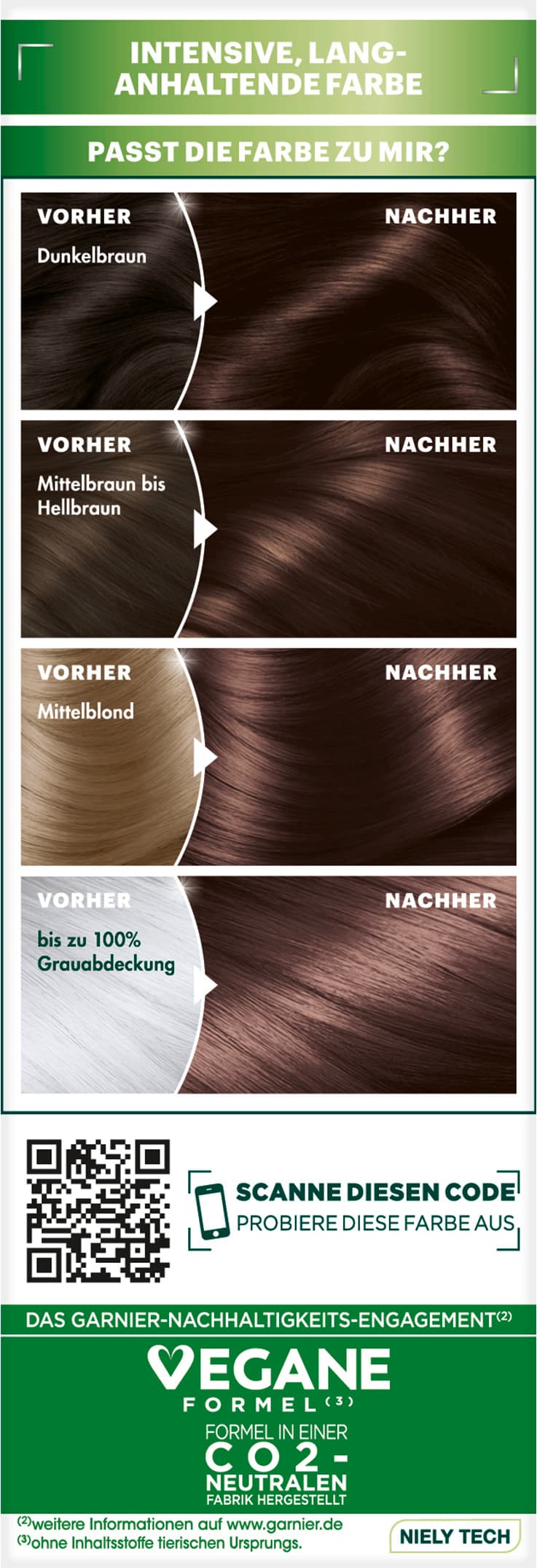 Garnier Nutrisse Creme verleiht dem Haar seidig strahlenden Glanz. Sogar graue Haare werden zu 100 % abgedeckt. Das Ergebnis ist eine Haarfarbe mit einem harmonischen Farbverlauf, das 8 Wochen lang farbintensiv strahlt.Besonders angenehm ist die einfache Anwendung der Coloration. Dank der Creme-Textur tropft sie nicht und lässt sich gleichmäßig ins Haar einarbeiten. Dabei versorgt sie das Haar intensiv mit Pflege, denn die Formel ist mit 5 Fruchtölen angereichert: Olive, Shea-Nuss, Avocado, Argan und Cranberry nähren das Haar in der Tiefe. Mit dem fruchtigen Duft wird das Colorieren zu einem sinnlichen Erlebnis.