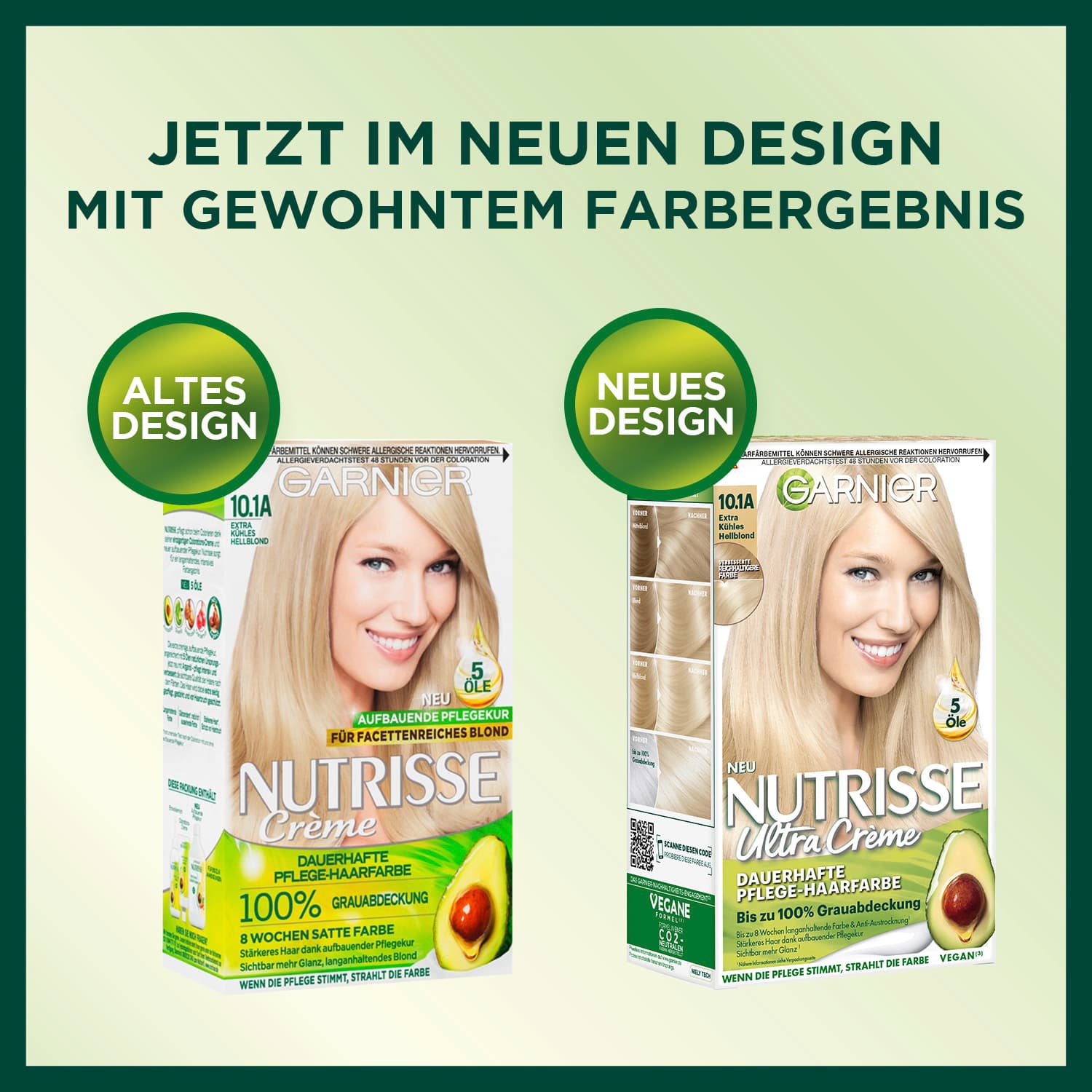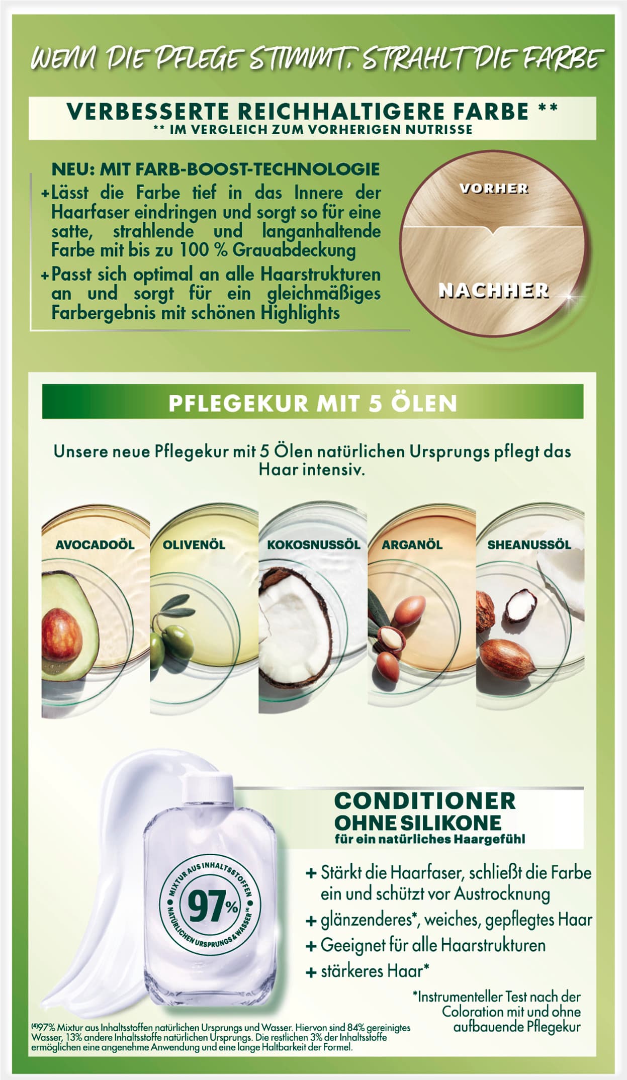 Garnier Nutrisse Creme verleiht dem Haar seidig strahlenden Glanz. Sogar graue Haare werden zu 100 % abgedeckt. Das Ergebnis ist eine Haarfarbe mit einem harmonischen Farbverlauf, das 8 Wochen lang farbintensiv strahlt.Besonders angenehm ist die einfache Anwendung der Coloration. Dank der Creme-Textur tropft sie nicht und lässt sich gleichmäßig ins Haar einarbeiten. Dabei versorgt sie das Haar intensiv mit Pflege, denn die Formel ist mit 5 Fruchtölen angereichert: Olive, Shea-Nuss, Avocado, Argan und Cranberry nähren das Haar in der Tiefe. Mit dem fruchtigen Duft wird das Colorieren zu einem sinnlichen Erlebnis.