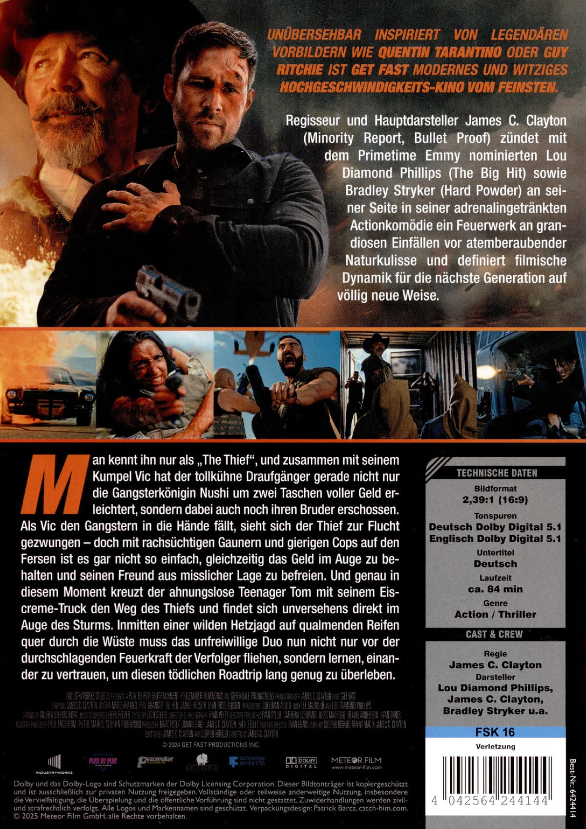 Man kennt ihn nur als „The Thief“, und zusammen mit seinem Kumpel Vic hat der tollkühne Draufgänger gerade nicht nur die Gangsterkönigin Nushi um zwei Taschen voller Geld erleichtert, sondern dabei auch noch ihren Bruder erschossen. Als Vic den Gangstern in die Hände fällt, sieht sich der Thief zur Flucht gezwungen – doch mit rachsüchtigen Gaunern und gierigen Cops auf den Fersen ist es gar nicht so einfach, gleichzeitig das Geld im Auge zu behalten und seinen Freund aus misslicher Lage zu befreien. Und genau in diesem Moment kreuzt der ahnungslose Teenager Tom mit seinem Eiscreme-Truck den Weg des Thiefs und findet sich unversehens direkt im Auge des Sturms. Inmitten einer wilden Hetzjagd auf qualmenden Reifen quer durch die Wüste muss das unfreiwillige Duo nun nicht nur vor der durchschlagenden Feuerkraft der Verfolger fliehen, sondern lernen, einander zu vertrauen, um diesen tödlichen Roadtrip lang genug zu überleben. Unübersehbar inspiriert von legendären Vorbildern wie Quentin Tarantino oder Guy Ritchie ist GET FAST modernes und witziges Hochgeschwindigkeits-Kino vom Feinsten. Regisseur und Hauptdarsteller James Clayton (Minority Report, Bullet Proof) zündet mit dem Primetime Emmy nominierten Lou Diamond Phillips (The Big Hit) sowie Bradley Stryker (Hard Powder) an seiner Seite in seiner adrenalingetränkten Actionkomödie ein Feuerwerk an grandiosen Einfällen vor atemberaubender Naturkulisse und definiert filmische Dynamik für die nächste Generation auf völlig neue Weise.