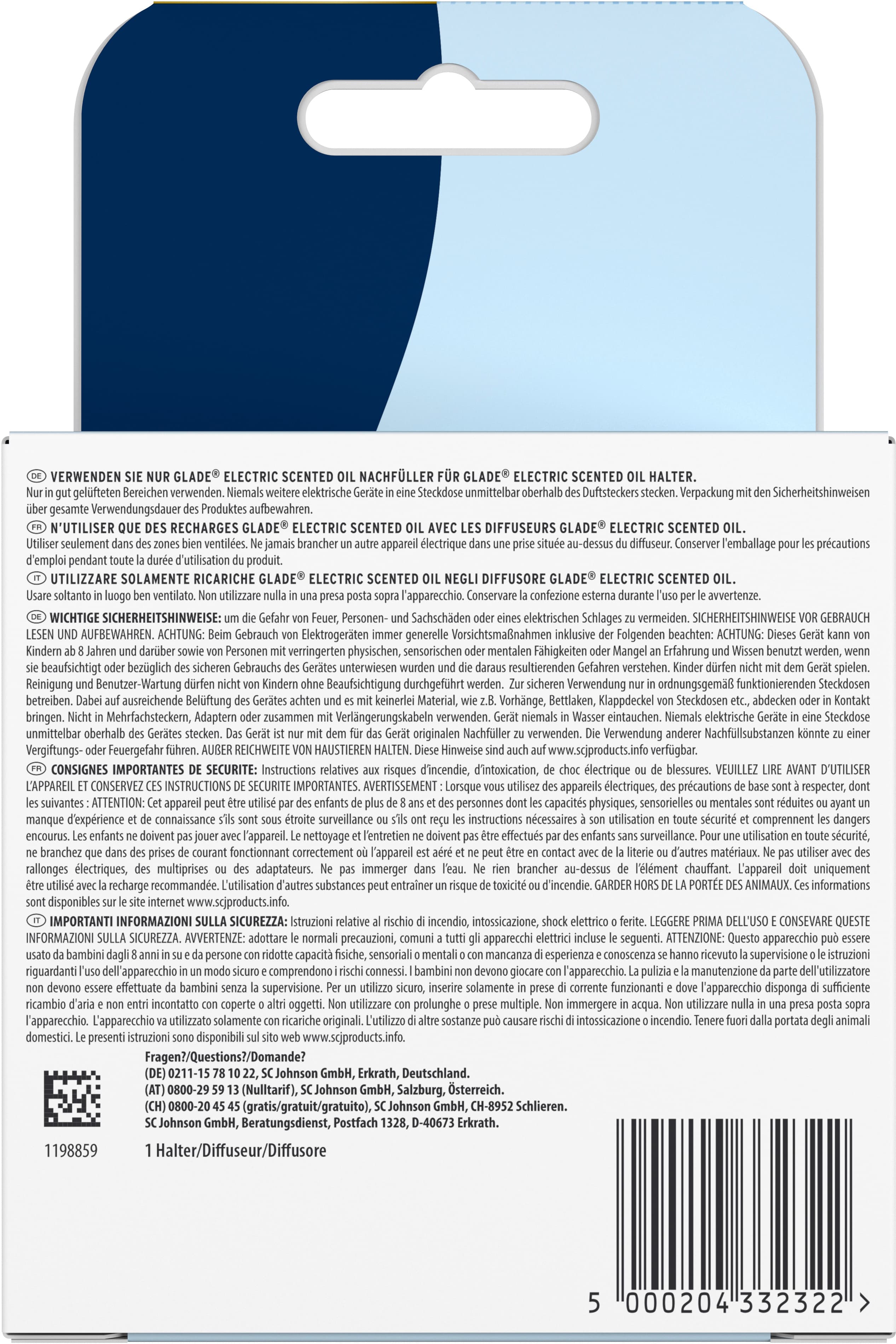 Glade Electric Scented Oil empfängt Sie und Ihre Gäste mit einem einzigartigen Dufterlebnis. Der elektrische Duftspender von Glade verleiht Ihrem Wohnzimmer, Schlafzimmer und Badezimmer, Ihrer Küche und anderen Räumen eine angenehm duftende Wohlfühlatmosphäre. Der Halter für die Steckdose ist formschön gestaltet und bietet aufgrund der neuen Duft-Technologie ein langanhaltendes Frische-Gefühl. Wählen Sie Ihre bevorzugte Duft-Einstellung und genießen Sie die reichhaltigen Duftaromen. Mit unserem neuen Konzept – Glade Electric Scented Oil – präsentieren wir Ihnen ein völlig neues Dufterlebnis. Aufgrund seines eleganten Designs und seiner einzigartigen Technologie bietet unser Produkt weiter gedachten Raumduft. Mit seinen fünf regulierbaren Duftstufen können Sie die Intensität individuell an Ihre Bedürfnisse anpassen und so Ihre persönliche Wohlfühloase kreieren. Zusätzlich bietet Ihnen unsere große Duftvielfalt die Möglichkeit, in jedem Raum die passende Stimmung zu erzeugen. Die einfach einzustellende Skala erlaubt erstklassige Duftabgabe zu jeder Zeit. Gebrauchsanweisung: 1. Drehen Sie bei Bedarf den elektrischen Stecker des Halters, um die Ausrichtung auf Ihre Steckdose anzupassen. 2. Halten Sie den Duftöl-Nachfüller stets aufrecht. Schrauben Sie die Kappe von dem Duftöl-Nachfüller ab und setzen Sie ihn in den Halter ein. 3. Stecken Sie den Halter aufrecht in die Steckdose. Bitte lesen Sie die wichtigen Sicherheitshinweise. 4. Erhalten Sie die gewünschte Duft-Intensität durch Anpassung der Regulierungsstufe. Nach Gebrauch Hände waschen. Glade verwendet ausschließlich Premium recycelbare Flaschen aus unzerbrechlichem Kunstoff. Zudem verbraucht Glade Electric Scented Oil 4 Mal weniger Strom als eine übliche LED-Lampe (9W mit 803 Lumen).