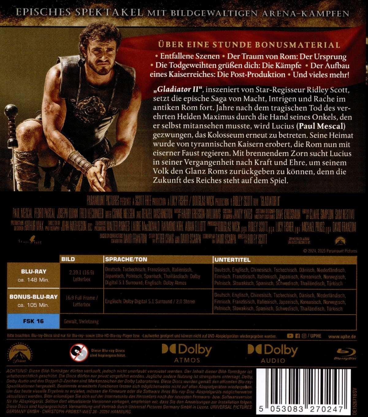 | Zusatzinfos / Bonusmaterial beim Film dabei | Enthält Blu-ray & Bonus Disc,Entfallene Szenen,Der Traum von Rom: Der Ursprung,Die Todgeweihten grüßen dich: Die Kämpfe,Der Aufbau eines Kaiserreiches: Die Post-Produktion,und vieles mehr |
