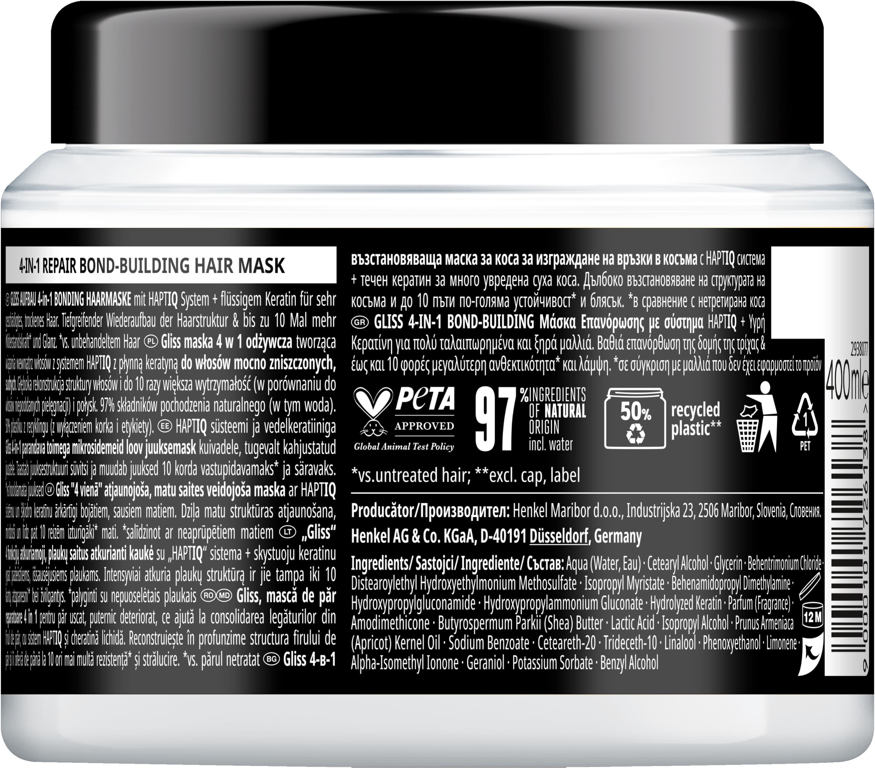 GLISS Aufbau 4-in-1 Bonding Haarmaske mit HaptIQ System + flüßigem Keratin für sehr geschädigtes, trockenes Haar. Tiefgreifender Wiederaufbau der Haarstruktur& bis zu 10 Mal mehr Widerstandskraft und Glanz.