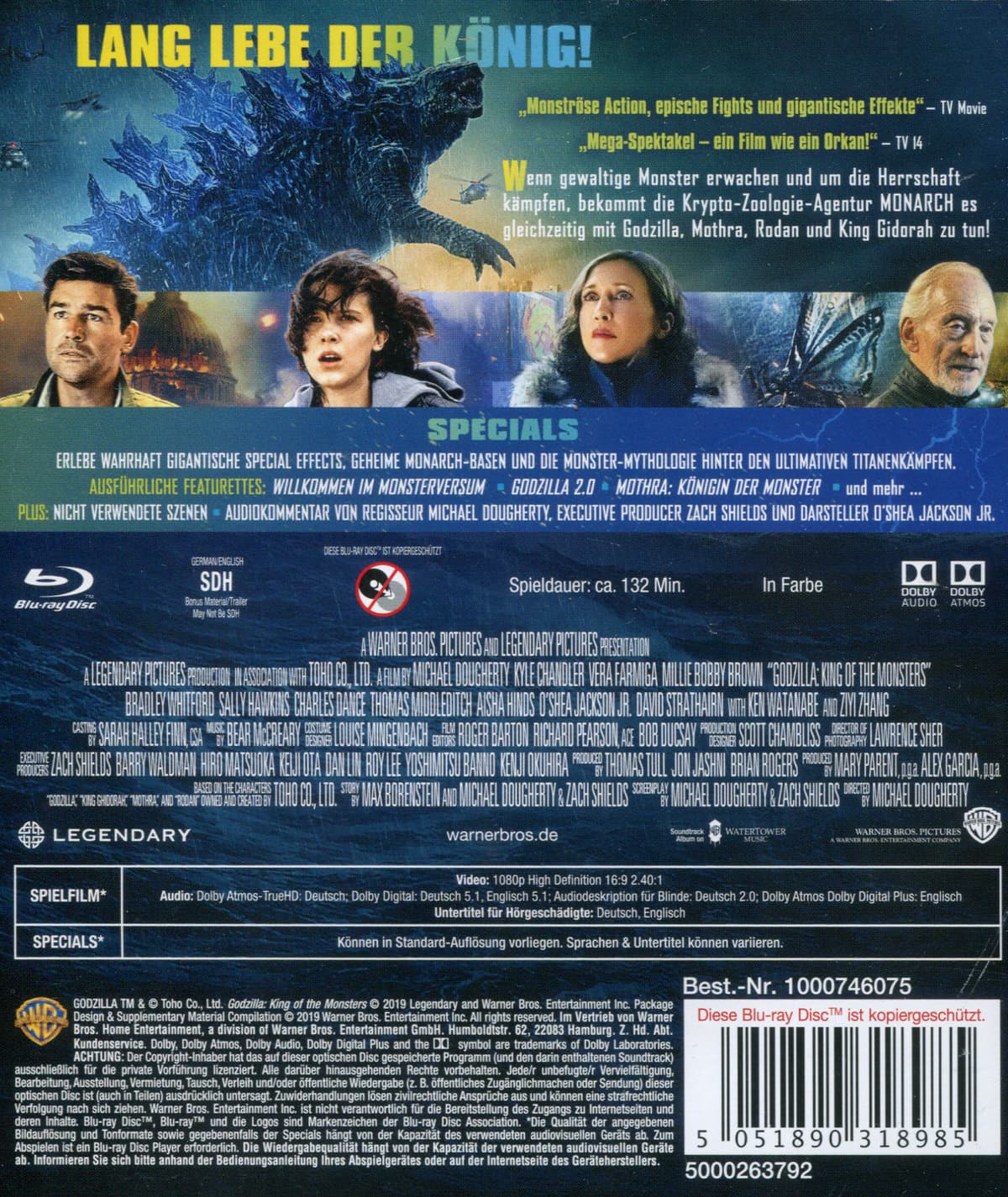 | Zusatzinfos / Bonusmaterial beim Film dabei | Special Effects; Geheime Monarch-Basen und die Monster-Mythologie hinter den Ultimativen Titanenkämpfen; Ausführliche Featurettes; Godzilla 2.0; Mothra: Königin der Monster; Nicht verwendete Szenen; Audiokommentare; |