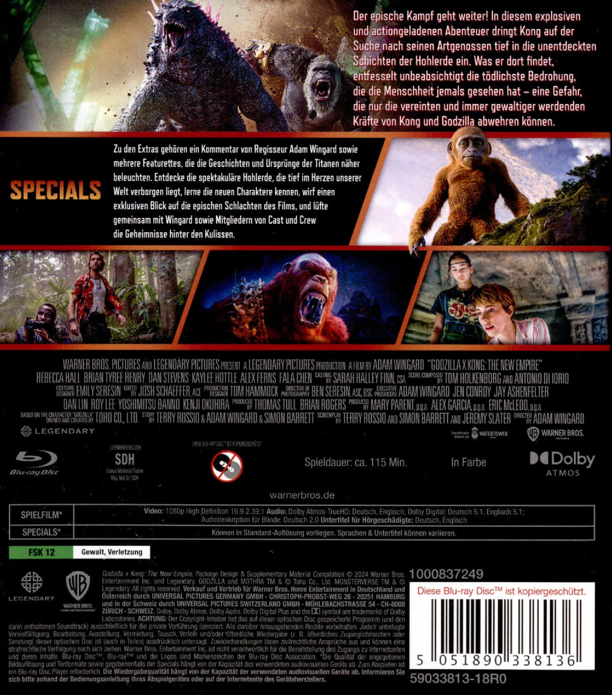 | Zusatzinfos / Bonusmaterial beim Film dabei | Kommentar von Regisseur Adam Wingard,mehrere Featurettes,Entdecke die spektakuläre Hohlerde,Lerne die neuen Charaktere kennen,Wirf einen Blick auf die Schlachten des Films,Lüfte die Geheimnisse hinter den Kulissen |