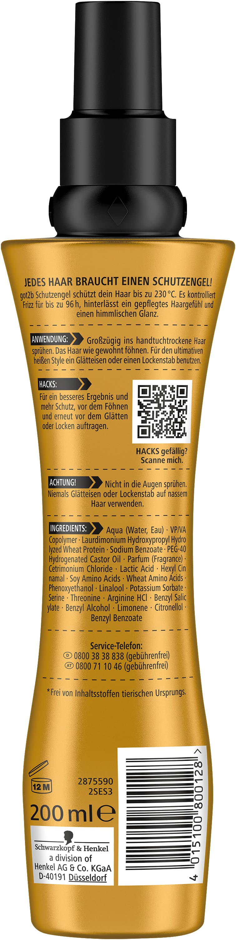 got2b Schutzengel Hitzeschutzspray – Der Beschützer für Haarstyles für bis 230°Jedes Haar braucht einen Schutzengel! Diese himmlisch pflegende Lotion ist ein Hitzeschutz in flüssiger Form und bewahrt das Haar vor Hitzeschäden bis zu 230 °C. Sie kontrolliert Frizz für bis zu 96 h, hinterlässt ein gepflegtes Haargefühl und einen himmlischen Glanz und ist somit die beste Voraussetzung für ein schonendes Styling mit Hitzetools wie Föhn, Glätteisen oder Lockenstab. Der Himmel auf Erden für das Haar! Die Formel ist vegan*. Anwendung: Das got2b Schutzengel Hitzeschutz-Spray großzügig ins handtuchtrockene Haar sprühen. Das Haar wie gewohnt föhnen. Für den ultimativen heißen Style ein Glätteisen oder einen Lockenstab benutzen. Hack: Für ein besseres Ergebnis und mehr Schutz, vor dem Föhnen und erneut vor dem Glätten oder Locken auftragen.Entzündbar. Nicht in die Augen sprühen. Niemals Glätteisen oder Lockenstab bei nassem Haar verwenden. *Frei von Inhaltsstoffen tierischen Ursprungs.