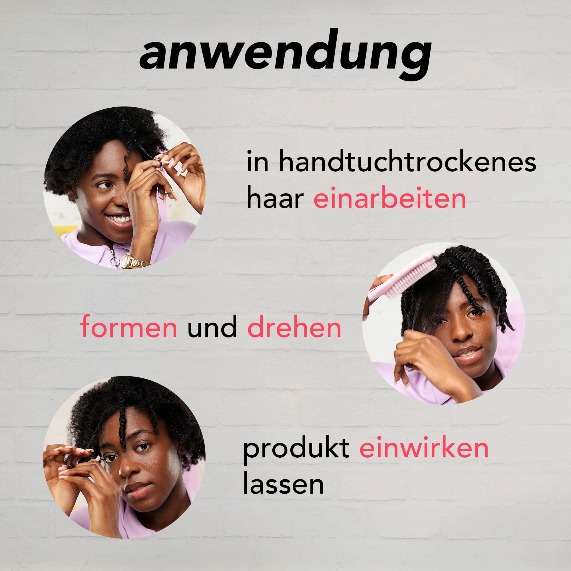 AnwendungshinweisNach dem Haarewaschen auf das handtuchtrockene Haar auftragen. Nicht ausspülen. Bei Bedarf erneut eine kleine Menge im trockenen Haar oder zur Auffrischung der Locken am nächsten Tag einarbeiten und stylen, wie es dir gefällt. Und weißt du was? Die Cream ist viel mehr als nur ein Leave-in! Du kannst sie auch als Maske tagsüber oder für intensive Feuchtigkeitspflege über Nacht verwenden. Pre-Shampoo: Vor dem Waschen 2-3 Minuten in dem trockenen/nassen Haar einwirken lassen. Spülung: Nach dem Waschen auf das nasse Haar auftragen. Gründlich ausspülen! Maske: Nach dem Waschen 3 Minuten lang einwirken lassen. Gründlich ausspülen!