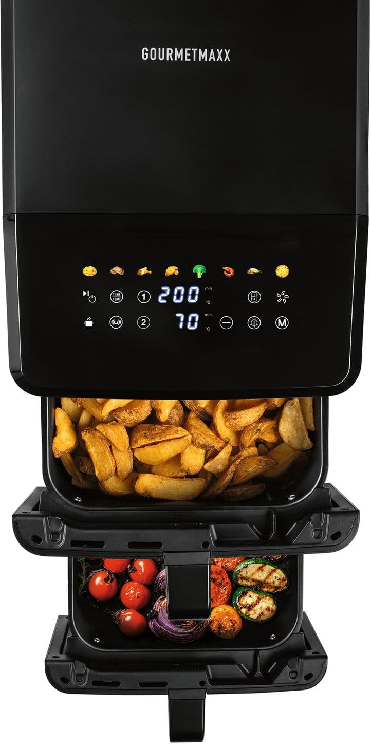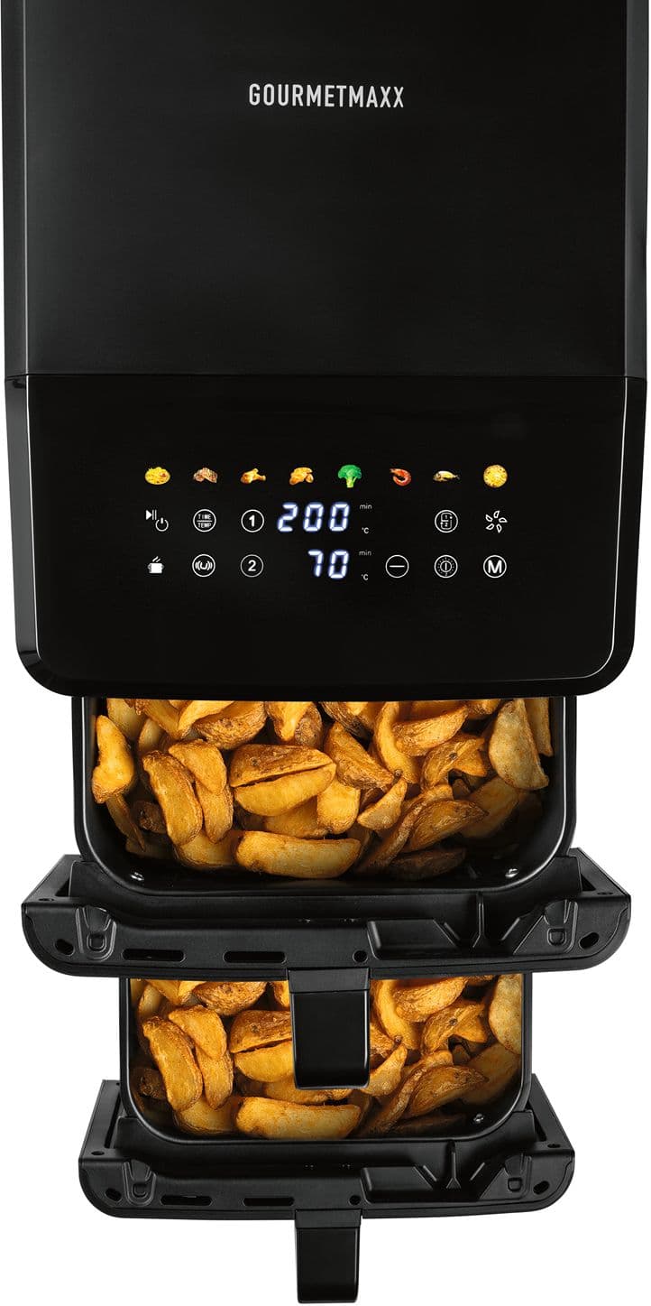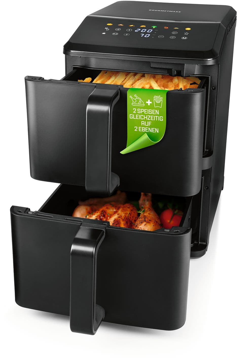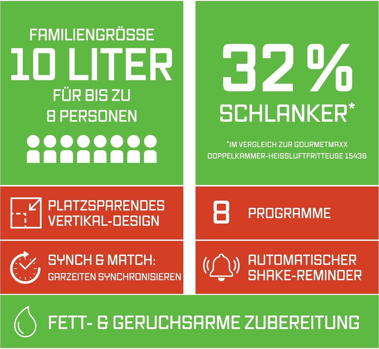 Entdecke die neue Art des Frittierens mit der GOURMETmaxx FryUp Vertikale Doppelkammer-Heißluftfritteuse im platzsparenden Hochformat-Design – perfekt für moderne Küchen und große Ansprüche. Auf dem LED-Display steuerst du mühelos alle Funktionen: Die intuitiven Icons und die präzise Berührungssensorik machen die Bedienung zum Kinderspiel. Durch den Neigungswinkel von 14,5° kannst du alles aus verschiedenen Blickhöhen klar ablesen – ganz ohne störende Reflexionen. Mit zwei unabhängigen 5-Liter-Garkammern (gesamt 10 Liter) bereitest du gleichzeitig verschiedene Speisen zu – für bis zu 8 Personen. Dank SYNC-Funktion kommen alle Gerichte zur gleichen Zeit auf den Tisch. Oder du nutzt die MATCH-Funktion für doppelte Portionen im selben Programm. Elf voreingestellte Programme und sechs praktische Funktionen – vom Frittieren über Braten bis zum Backen – geben dir maximale Vielfalt. Der Shake-Reminder sorgt für perfekte Ergebnisse, während die Oberhitze jede Speise besonders kross macht. Mit bis zu 2400 Watt Leistung, Temperaturen bis 200°C und einem Timer (0–60 Minuten) hast du die volle Kontrolle. Und das Beste: Mit der GOURMETmaxx FryUp Vertikale Doppelkammer-Heißluftfritteuse kochst du nahezu fettfrei, geruchsarm – und reinigst alles ganz leicht dank antihaftbeschichteter, spülmaschinengeeigneter Körbe. So geht smarter Genuss für dich, deine Familie und deine Gäste.
