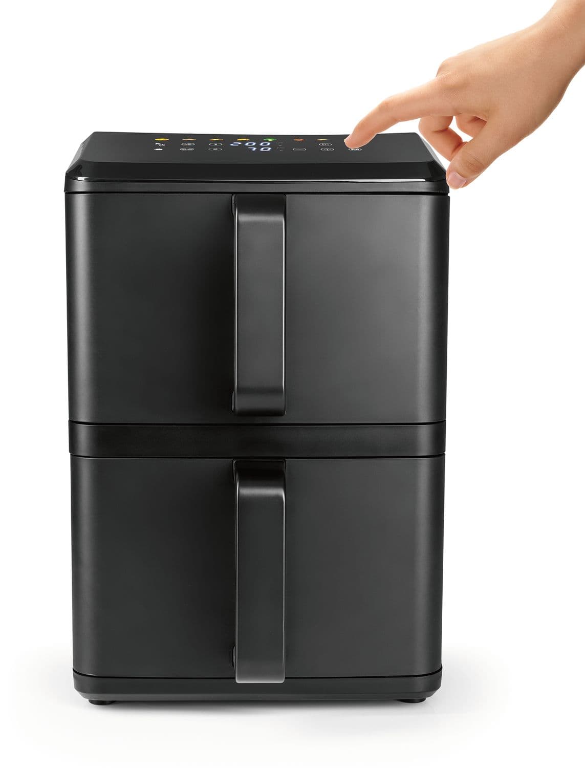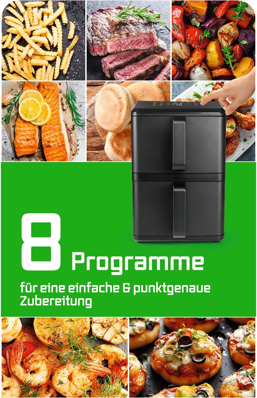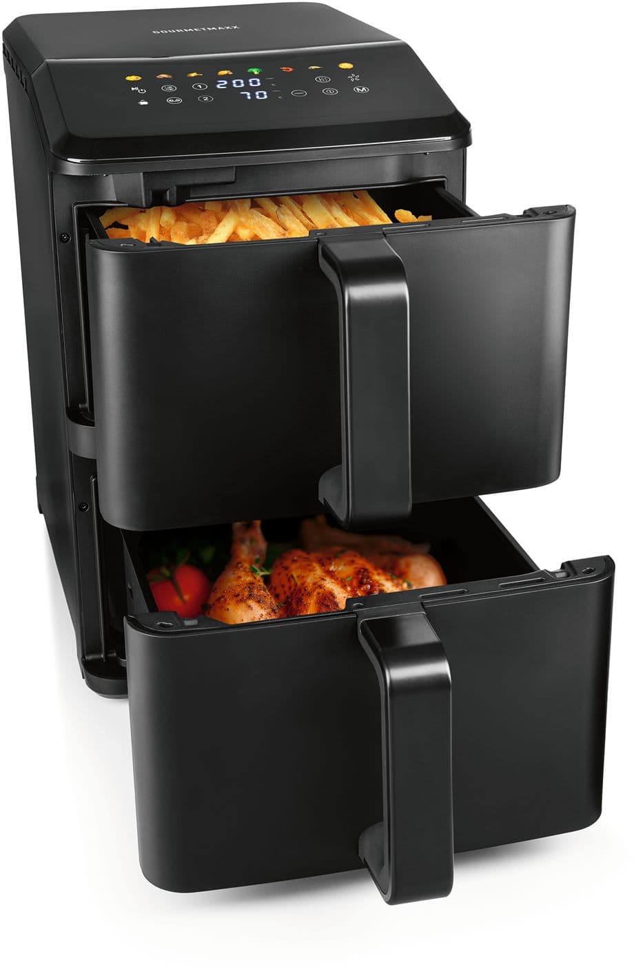 Entdecke die neue Art des Frittierens mit der GOURMETmaxx FryUp Vertikale Doppelkammer-Heißluftfritteuse im platzsparenden Hochformat-Design – perfekt für moderne Küchen und große Ansprüche. Auf dem LED-Display steuerst du mühelos alle Funktionen: Die intuitiven Icons und die präzise Berührungssensorik machen die Bedienung zum Kinderspiel. Durch den Neigungswinkel von 14,5° kannst du alles aus verschiedenen Blickhöhen klar ablesen – ganz ohne störende Reflexionen. Mit zwei unabhängigen 5-Liter-Garkammern (gesamt 10 Liter) bereitest du gleichzeitig verschiedene Speisen zu – für bis zu 8 Personen. Dank SYNC-Funktion kommen alle Gerichte zur gleichen Zeit auf den Tisch. Oder du nutzt die MATCH-Funktion für doppelte Portionen im selben Programm. Elf voreingestellte Programme und sechs praktische Funktionen – vom Frittieren über Braten bis zum Backen – geben dir maximale Vielfalt. Der Shake-Reminder sorgt für perfekte Ergebnisse, während die Oberhitze jede Speise besonders kross macht. Mit bis zu 2400 Watt Leistung, Temperaturen bis 200°C und einem Timer (0–60 Minuten) hast du die volle Kontrolle. Und das Beste: Mit der GOURMETmaxx FryUp Vertikale Doppelkammer-Heißluftfritteuse kochst du nahezu fettfrei, geruchsarm – und reinigst alles ganz leicht dank antihaftbeschichteter, spülmaschinengeeigneter Körbe. So geht smarter Genuss für dich, deine Familie und deine Gäste.