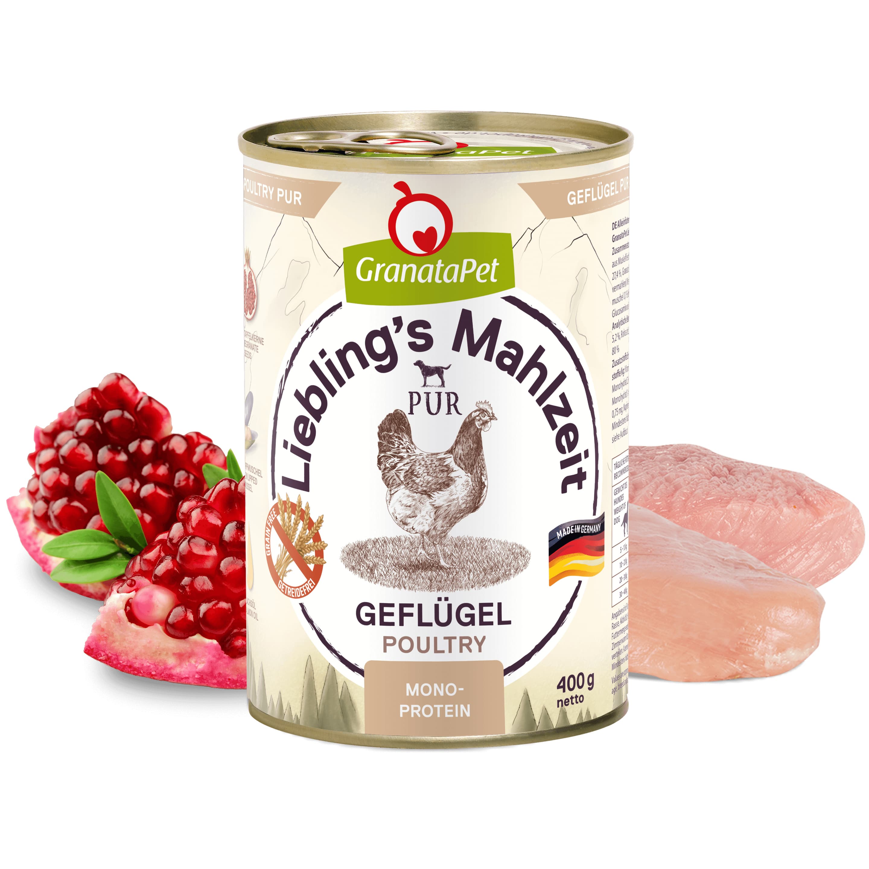GranataPet Liebling’s Mahlzeit PUR Geflügel ist eine klassische, herzhafte Reinfleischdose (single animal protein) und ist besonders für Hunde mit Unverträglichkeiten geeignet. Auch hier setzen wir auf eine frische Zubereitung der Vollwertnahrung, die nur einmalig schonend dampfgegart wird. IN Deutschland, MIT Granatapfelkernen zum Zellschutz, MIT Lachsöl, MIT Grünlippmuschel zum Gelenkschutz, OHNE Getreide, OHNE Gluten, OHNE Weizen, OHNE Reis, OHNE Mais, OHNE Soja, OHNE Zuckerzusatz, OHNE künstliche Konservierungsmittel, OHNE künstliche Farb- und Aromastoffe, OHNE gentechnisch veränderte Organismen, OHNE Tierversuche
