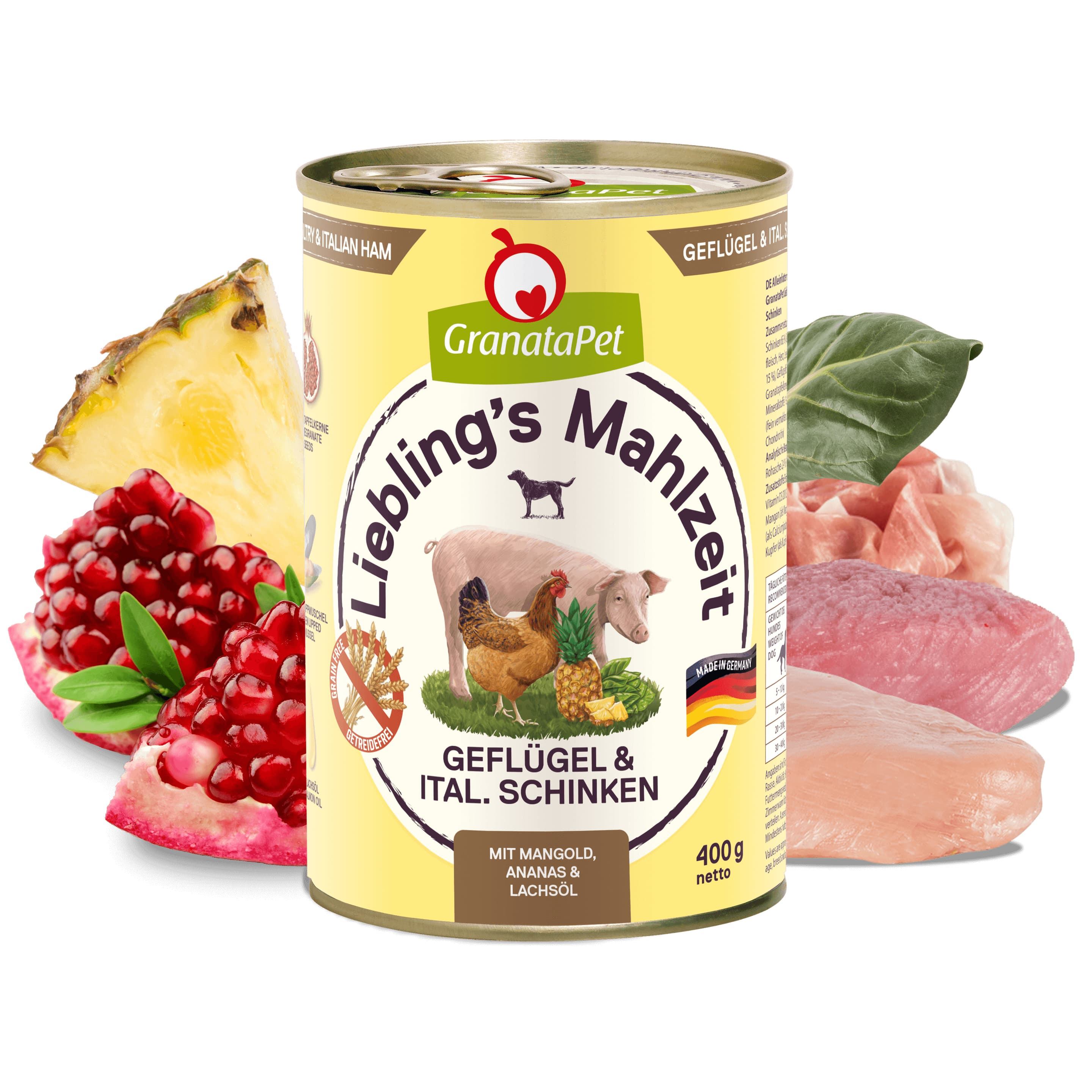 GranataPet Liebling’s Mahlzeit Geflügel&Italienischer Schinken ist mit seinem hohen Fleischanteil und der fein abgestimmten Zusammensetzung die ideale, ausgewogene Vollwertnahrung, die nur einmalig schonend dampfgegart wird, um alle wichtigen Nährstoffe zu erhalten. Durch die gezielte Zugabe von Mangold, Ananas und Lachsöl wird dieses Hundefutter bewusst verfeinert und schafft es, ausschließlich mit gesunden und leckeren Zutaten jedes Hundeherz zu erobern. IN Deutschland, MIT Granatapfelkernen zum Zellschutz, MIT hochwertigen Ölen, MIT Grünlippmuschel zum Gelenkschutz, OHNE Getreide, OHNE Gluten, OHNE Weizen, OHNE Reis, OHNE Mais, OHNE Soja, OHNE Zuckerzusatz, OHNE künstliche Konservierungsmittel, OHNE Farb- und Aromastoffe, OHNE gentechnisch veränderte Organismen, OHNE Tierversuche
