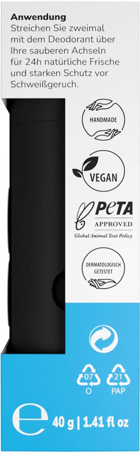 | Anwendungshinweis | Streiche zweimal mit dem Deodorant über deine Achseln für 24h natürliche Frische und starken Schutz vor Schweißgeruch. |