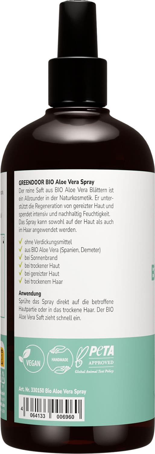 Das Bio Aloe Vera Spray von GREENDOOR versorgt Ihre Haut mit extra Feuchtigkeit, kühlt und lindert. Der reine Saft aus den Blättern der Aloe Vera Pflanze ist ein Allrounder in der Naturkosmetik. Der Saft unserer Aloe Vera Blätter stammt aus einer biodynamisch zertifizierten Farm im Südosten von Spanien.
