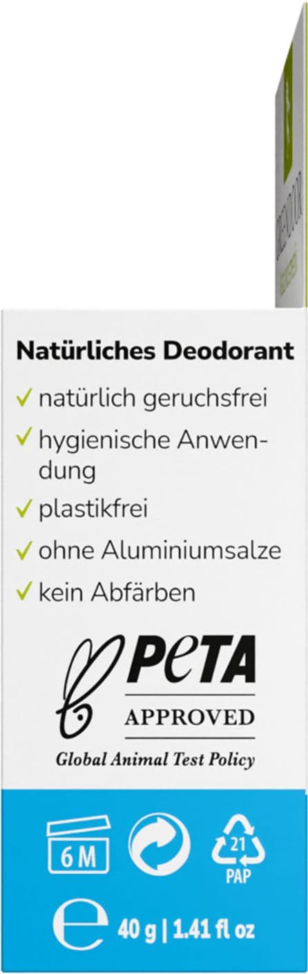 | Anwendungshinweis | Streiche zweimal mit dem Deodorant über deine Achseln für 24h natürliche Frische und starken Schutz vor Schweißgeruch. |
