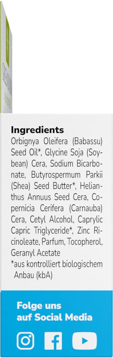 | Inhaltsstoffe | Orbignya Oleifera Seed Oil*, Glycine Soja Cera, Sodium Bicarbonate, Butyrospermum Parkii Butter*, Helianthus Annuus Seed Cera, Copernicia Cerifera Cera, Cetyl Alcohol, Caprylic Capric Triglyceride*, Zinc Ricinoleate, Parfum, Tocopherol, Geranyl Acetate * = aus kontrolliert biologischem Anbau (kbA) / organic |