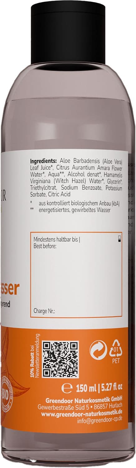 | Inhaltsstoffe | Aloe Barbadensis Leaf Juice*, Citrus Aurantium Amara Flower Water*, Aqua**, Alcohol*, Hamamelis Virginiana Water*, Glycerin*, Sodium Benzoate, Potassium Sorbate, Citric Acid, Geraniol, Limonene, Linalool, Eugenol, Farnesol * = aus kontrolliert biologischem Anbau (kbA) / organic ** = energetisiertes, gewirbeltes Wasser |