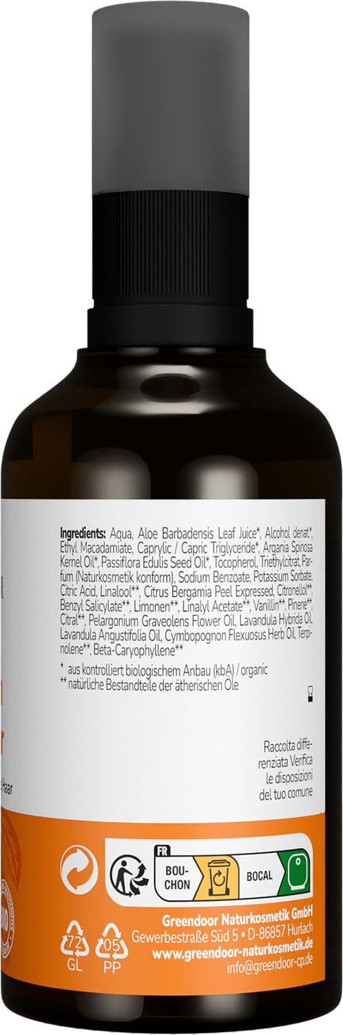 | Inhaltsstoffe | Aqua, Aloe Barbadensis Leaf Juice*, Alcohol denat.*, Ethyl Macadamiate, Caprylic / Capric Triglyceride*, Argania Spinosa Kernel Oil*, Passiflora Edulis Seed Oil*, Tocopherol, Triethylcitrat, Parfum (Naturkosmetik konform), Sodium Benzoate, Potassium Sorbate, Citric Acid, Linalool**, Citrus Bergamia Peel Expressed, Citronellol**, Benzyl Salicylate**, Limonen**, Linalyl Acetate**, Vanillin**, Pinene**, Citral**, Pelargonium Graveolens Flower Oil, Lavandula Hybrida Oil, Lavandula Angustifolia Oil, Cymbopognon Flexuosus Herb Oil, Terpinolene**, Beta-Caryophyllene** * aus kontrolliert biologischem Anbau (kbA) / organic ** natürliche Bestandteile der ätherischen Öle |