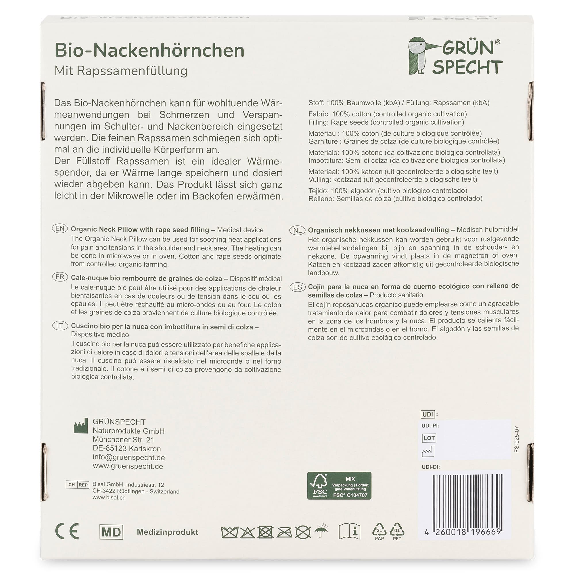 PflegehinweisPflegehinweise und Lagerung<br> Das Bio-Nackenhörnchen nicht waschen, um Fäulnis/Schimmelbildung zu verhindern! Produkt trocken lagern! Vor Feuchtigkeit schützen! <br><br> Hinweise zur Haltbarkeit und Entsorgung<br> Das Produkt sollte bei normalem Gebrauch nach 4 Jahren ersetzt werden. Das Produkt kann im Hausmüll entsorgt und ohne Probleme thermisch verwertet werden. Die einzelnen Bestandteile der Verpackung bitte sortenrein trennen und dem entsprechenden Recycling-System zuführen. Bitte beachten Sie die regionalen Entsorgungsrichtlinien