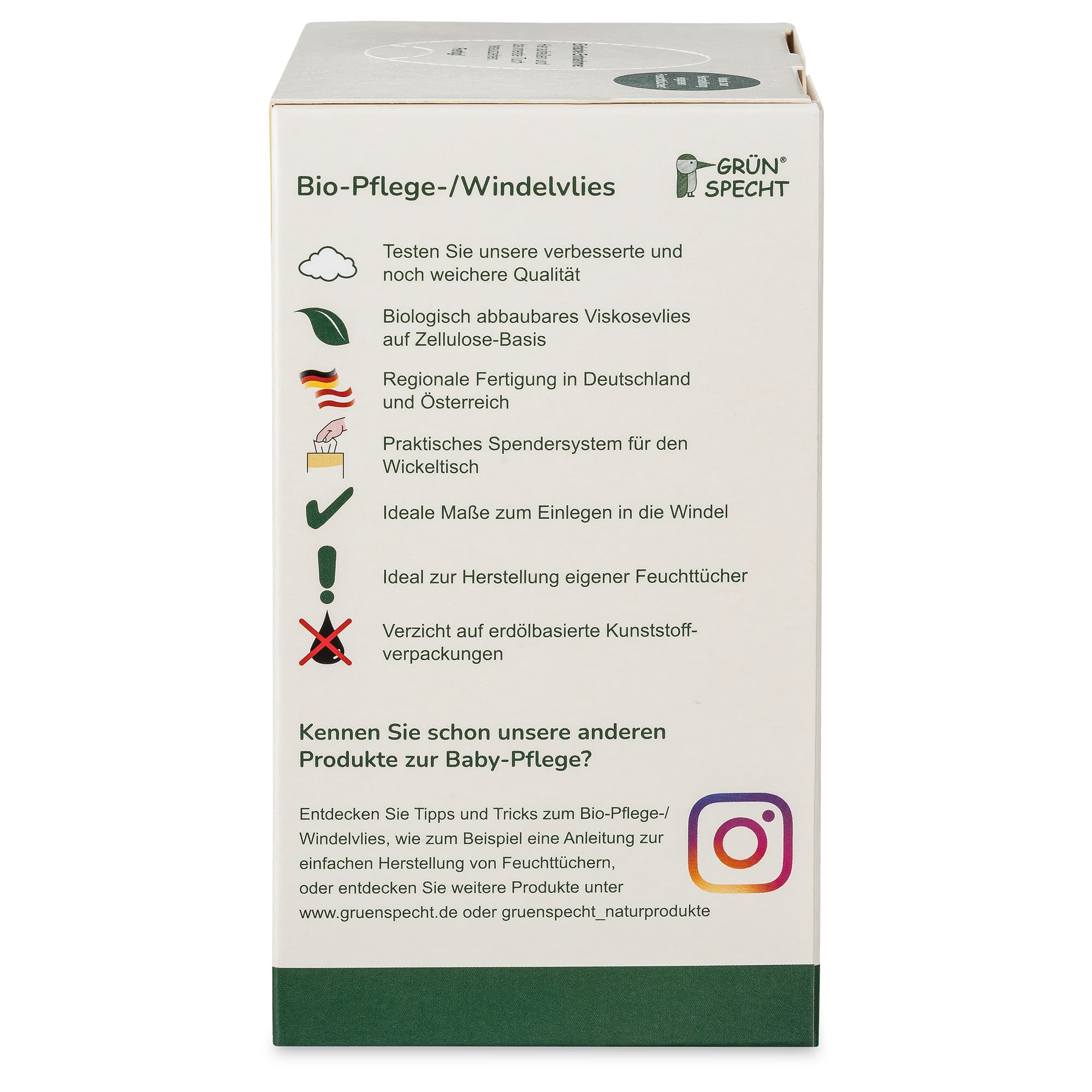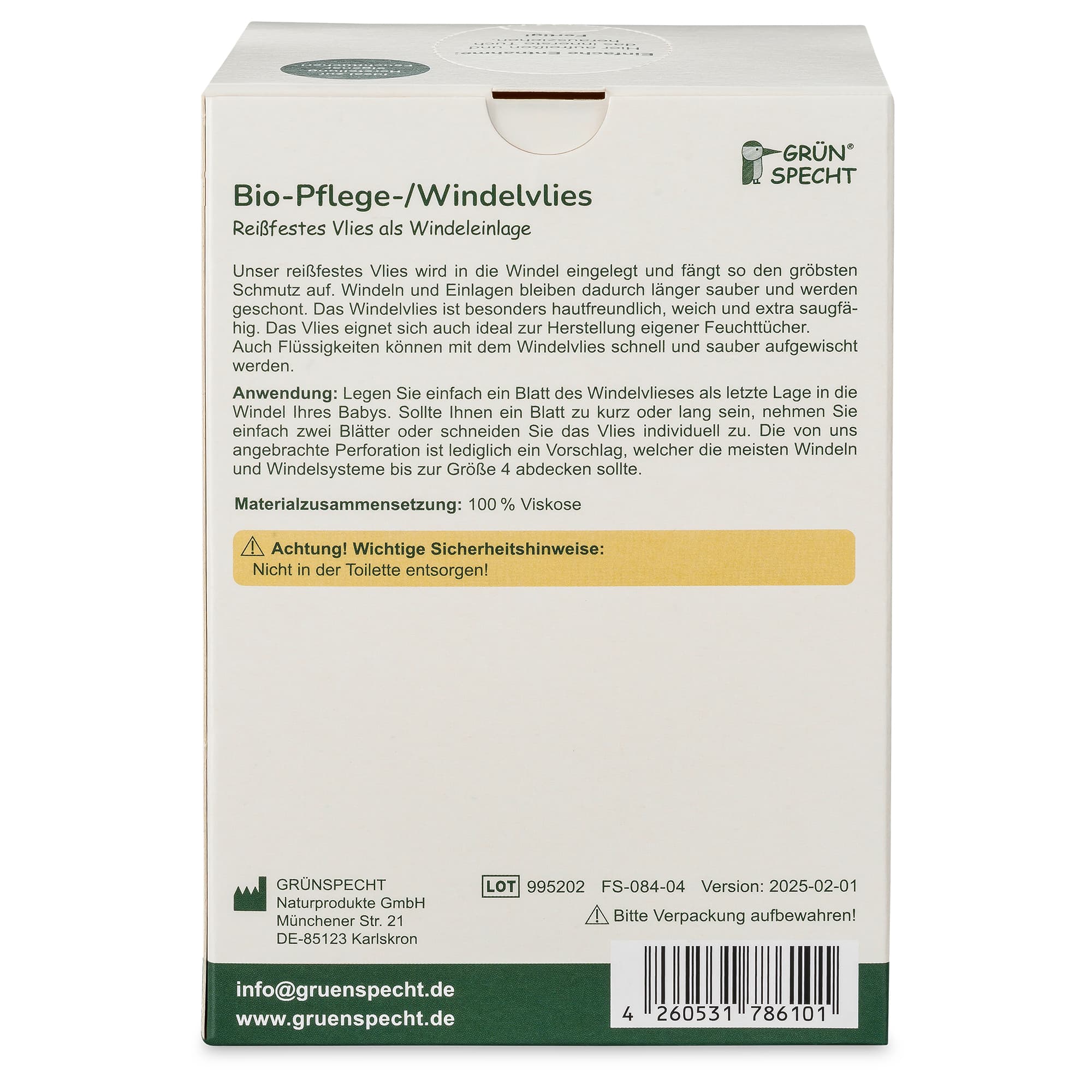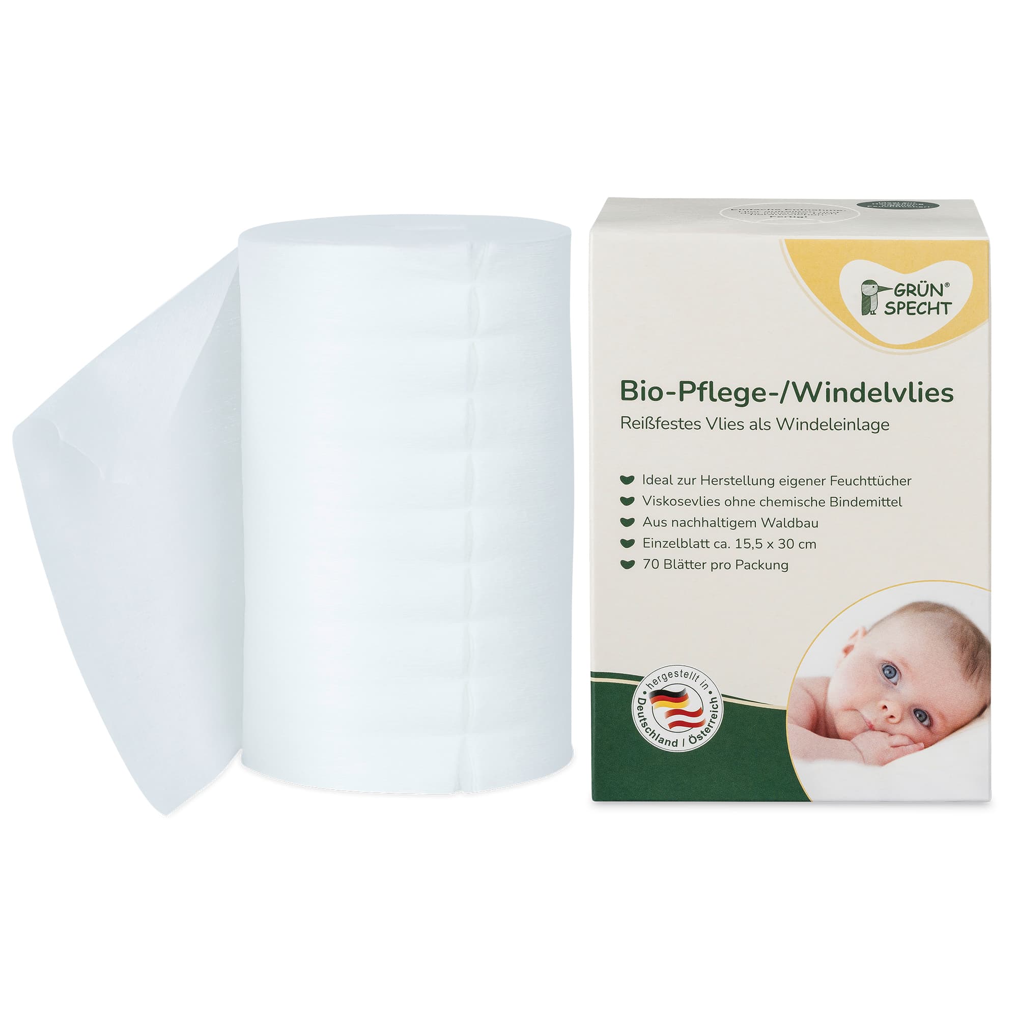 Das reißfeste Vlies wird in die Windel eingelegt und fängt so den gröbsten Schmutz auf. Windeln und Einlagen bleiben dadurch länger sauber und werden geschont. Das Windelvlies ist besonders hautfreundlich, weich und extra saugfähig. Das Vlies eignet sich auch ideal zur Herstellung eigener Feuchttücher. Auch Flüssigkeiten können mit dem Windelvlies schnell und sauber aufgewischt werden.Material: Ohne chemische Zusätze und Bindemittel, ohne Rückstände biologisch abbaubar, Verzicht auf erdölbasierte Kunststoffverpackungen.