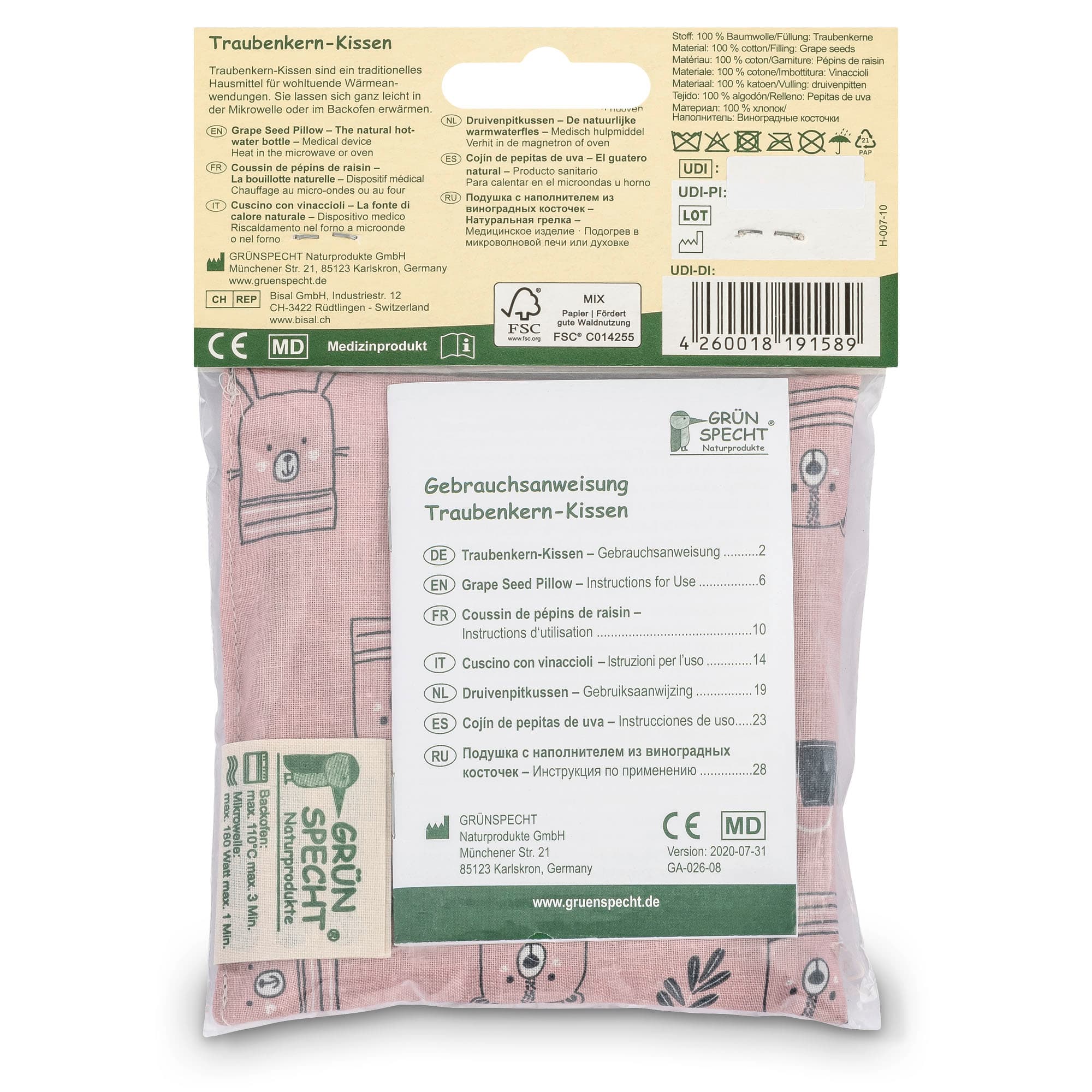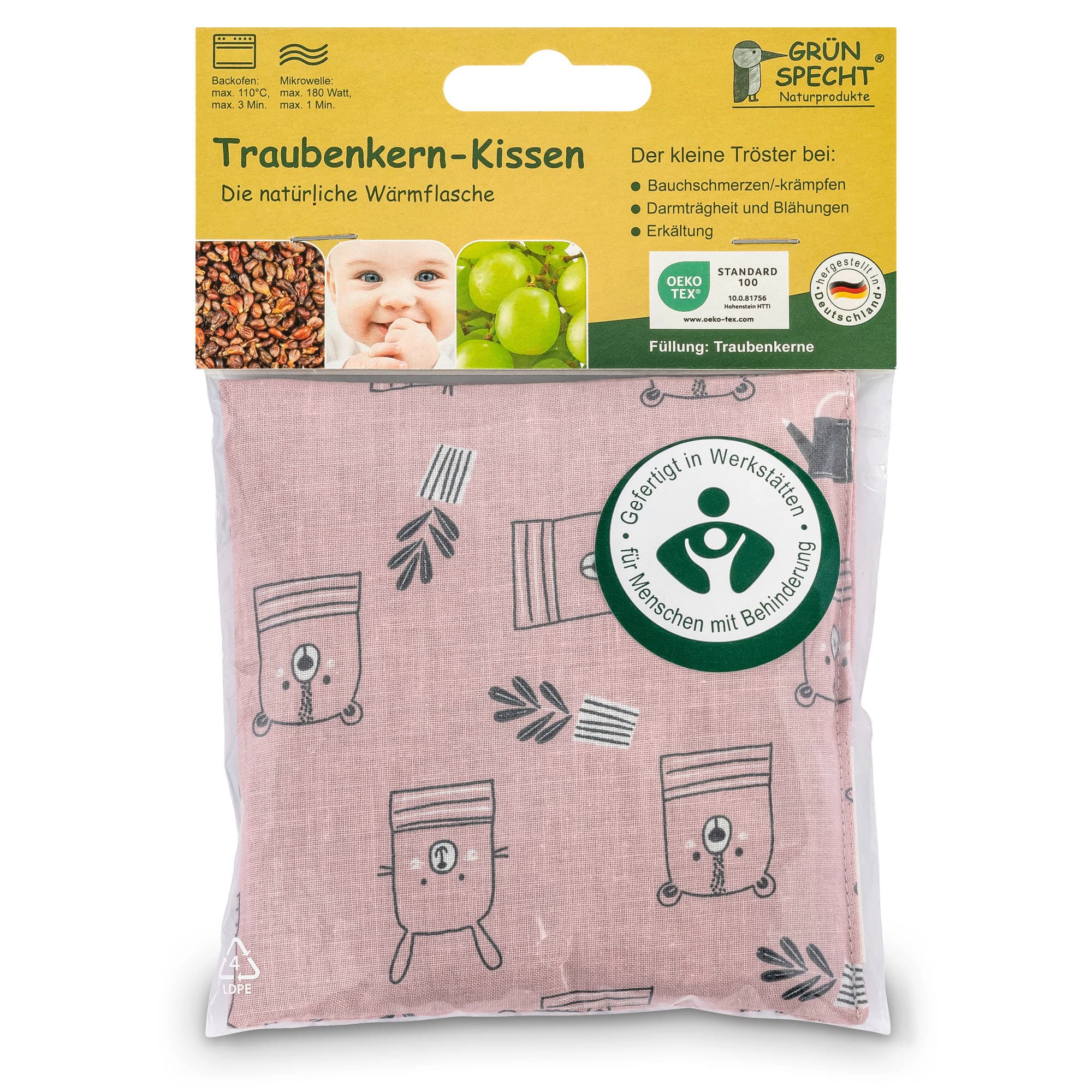 Halten Sie sich unbedingt an die angegebenen Erwärmungshinweise, da längere Zeiten oder höhere Energieleistungen zu Schäden führen können (Entflammungs- und Verbrennungsgefahr!). Prüfen Sie vor einer Erwärmung des Kissens in der Mikrowelle, dass eine Erhitzung von Körnerprodukten in der Gebrauchsanweisung des Herstellers erlaubt ist. Nach dem Erwärmen die Temperatur des Kissens auf Eignung für Babys (max. 43 °C) an Ihrer Armbeuge prüfen! Kissen von einer erwachsenen Person, nur unter Aufsicht und nicht feucht erwärmen! Kissen vor dem nächsten Erwärmen abkühlen lassen! Das Produkt sollte keinesfalls als Kopfkissen oder Sitzgelegenheit verwendet werden. Bitte suchen Sie bei anhaltenden oder sich verschlechternden Symptomen einen Arzt auf. Verwenden Sie das Kissen nicht bei akuten und chronischen, entzündlichen oder fieberhaften Erkrankungen, Kreislaufbeschwerden, frischen Hämatomen, Blutergüssen und offenen Wunden sowie bei Personen mit verringertem Schmerzempfinden. Bei bestehenden Haut-, Herz-, Venen, Diabetes- oder Tumorerkrankungen sowie einer Schwangerschaft bitte vor der Anwendung an einen Arzt wenden. Achten Sie auf unversehrte Nähte! Bei losen Traubenkernen besteht Verschluckungs- und Erstickungsgefahr! Benutzung nur unter unmittelbarer Aufsicht von Erwachsenen! Sollten sich Nähte geöffnet haben und lose Kerne austreten, entsorgen Sie das Produkt und die losen Kerne sofort und unzugänglich für Kinder. Wird das Produkt bei Babys unter 1 Jahr angewendet, sollte die Temperatur des Kindes während der Anwendung regelmäßig kontrolliert werden, um Überhitzung auszuschließen! Alle im Zusammenhang mit dem Produkt aufgetretenen schwerwiegenden Vorfälle sind dem Hersteller und der zuständigen Behörde des Landes, in dem der Anwender niedergelassen ist, zu melden.