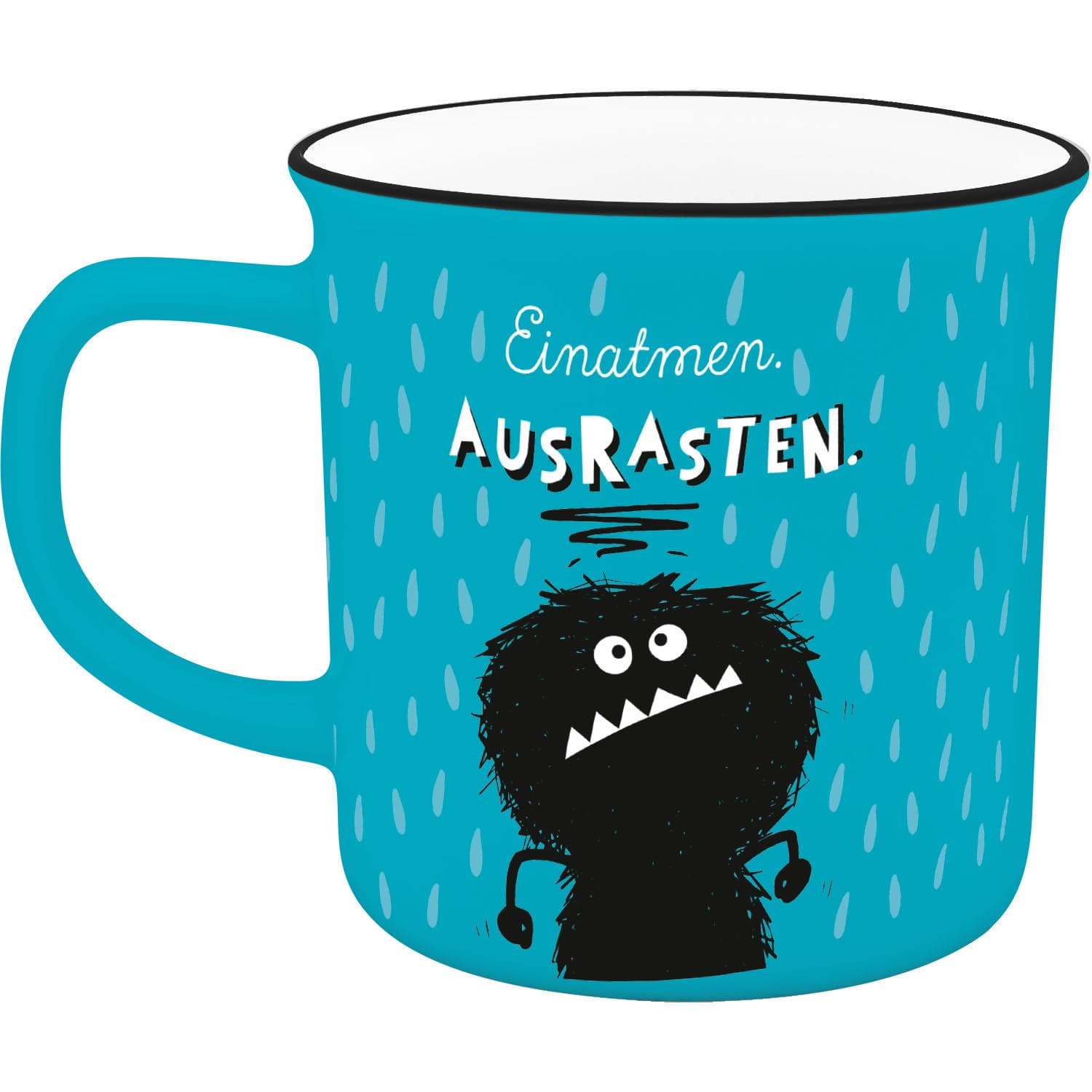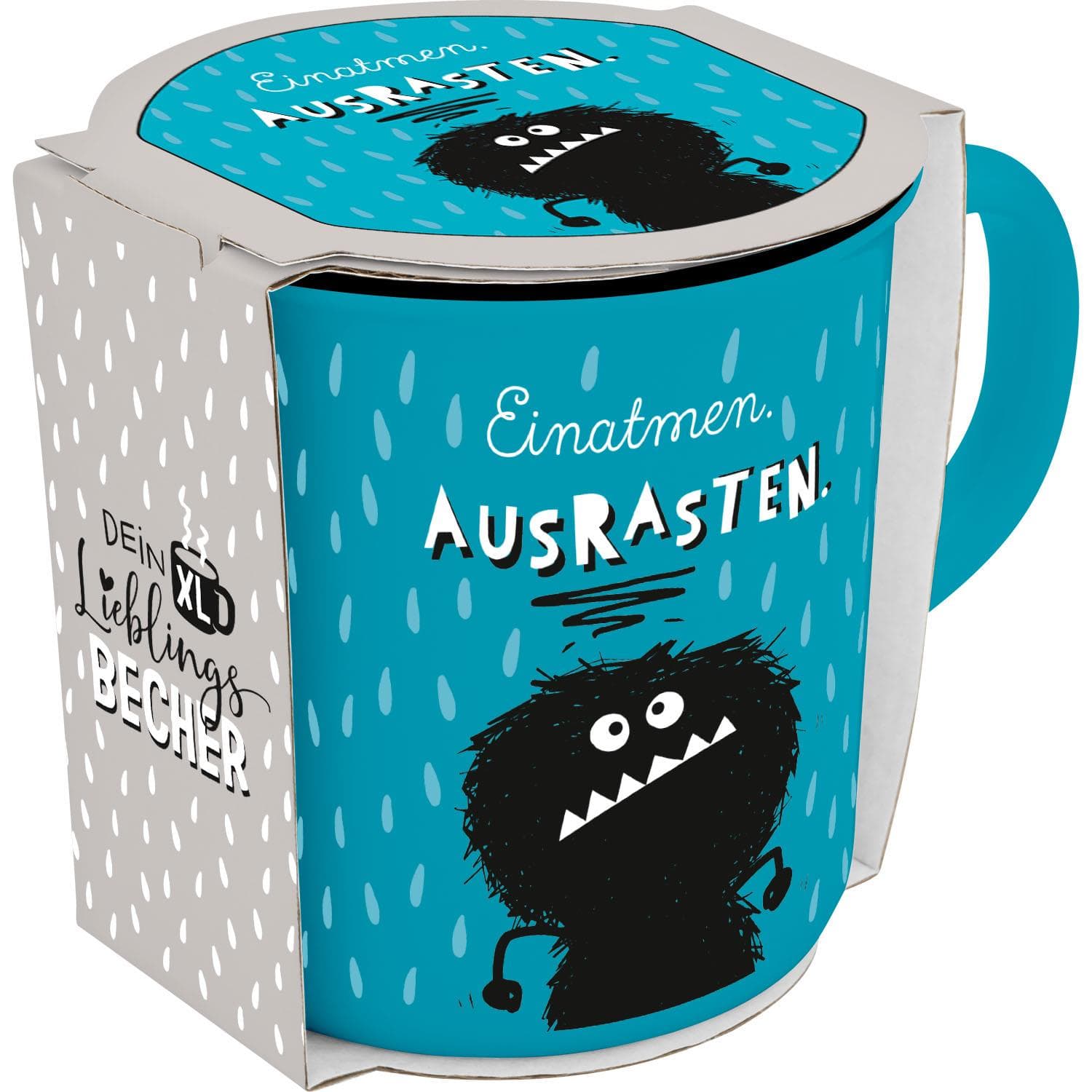 XL-Becher in Emaille Optik mit Motivdruck: Einatmen. Ausrasten.