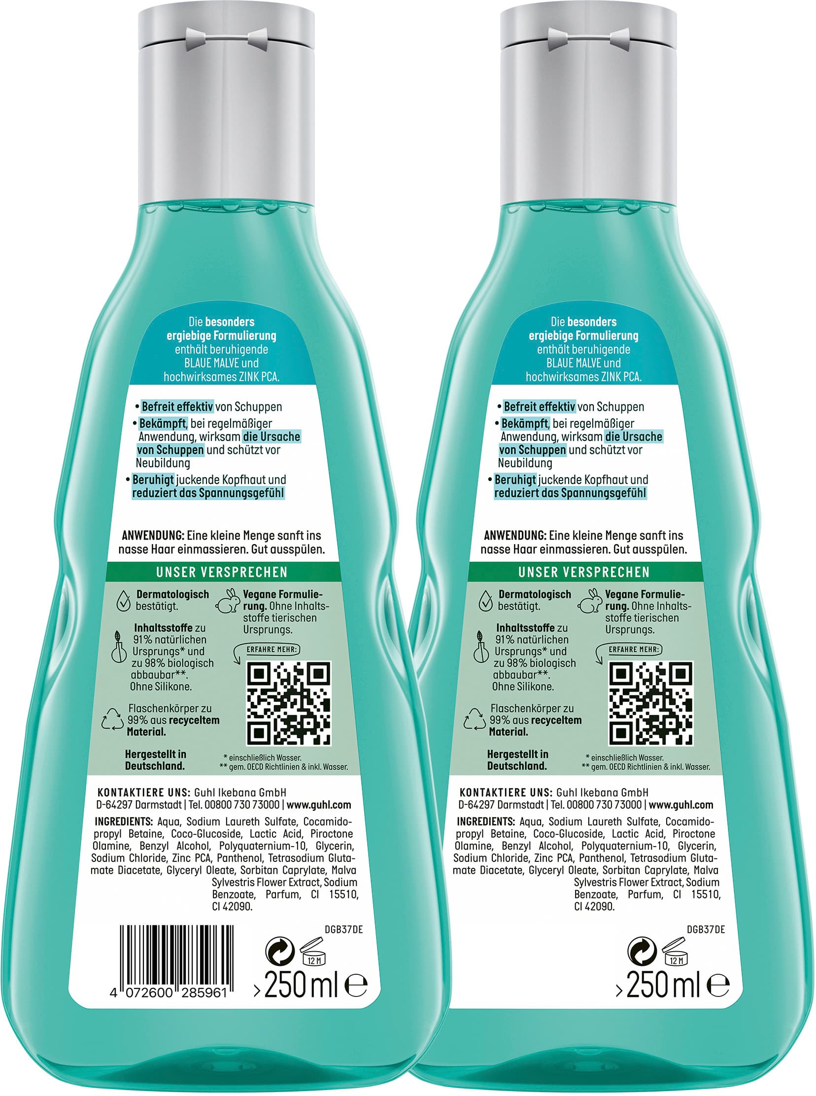Besänftigend: Das Anti-Schuppen-Shampoo verschafft bei Schuppen, juckender Kopfhaut und Spannungsgefühlen einen beruhigten, entspannten Kopf Echte Qualität, der du vertrauen kannst, so dass du deinen Wohlfühlmoment unbeschwert genießen kannst. Das ist Guhl. Seitüber 75 Jahren nutzen wir unsere Expertise& Leidenschaft und kreieren hochwertige Haarpflegeprodukte, auf die du dich verlassen kannst. Guhl sorgt für sichtbar& spürbar gepflegtes Haar, ist dermatologisch bestätigt, PETA zertifiziert, enthält regionale Inhaltsstoffe und wird in Deutschland hergestellt! Augen zu, Musik an& genießen! Unsere Versprechen: Dermatologisch bestätigt - Inhaltsstoffe zu 91% natürlichen Ursprungs& zu 98% biologisch abbaubar - Hergestellt in Deutschland Wirkungsvoll: Das Shampoo gegen Schuppen beruhigt juckende, trockene oder fettige Kopfhaut und befreit effektiv von Schuppen Anhaltender Effekt: Bekämpft bei regelmäßiger Anwendung wirksam die Ursache von Schuppen und schützt vor Neubildung Sensitive Rezeptur: Beruhigende blaue Malve besänftigt gereizte und juckende Haut - Hochwirksames Zink PCA wirkt talgregulierend und antimikrobiell gegen Bakterien Besänftigend: Das Anti-Schuppen-Shampoo verschafft bei Schuppen, juckender Kopfhaut und Spannungsgefühlen einen beruhigten, entspannten Kopf