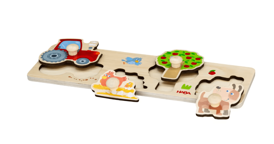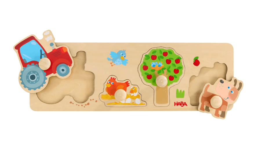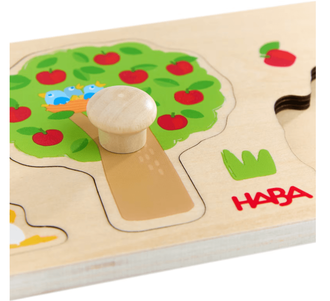 Jedes Puzzleteil hat seinen Platz … Wer kann Traktor, Apfelbaum & Co. richtig zuordnen und die entsprechenden Teile passend in die Aussparung setzen? Die großen Elemente mit griffigen Holz-Knöpfen sind leicht zu händeln, was für schnelle Puzzle-Erfolgserlebnisse sorgt.