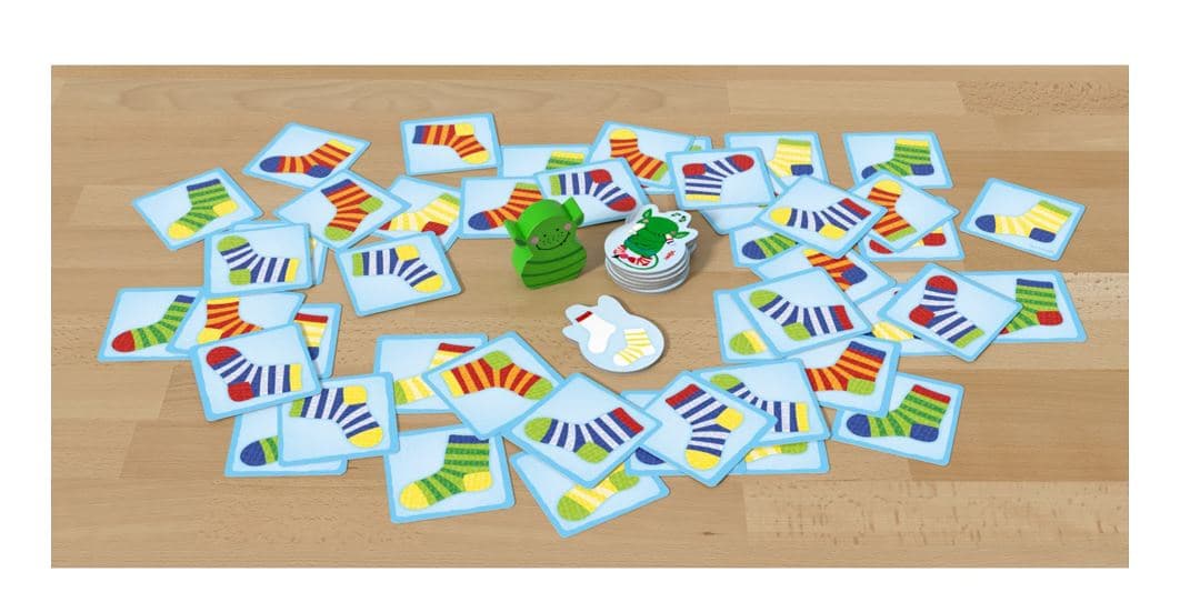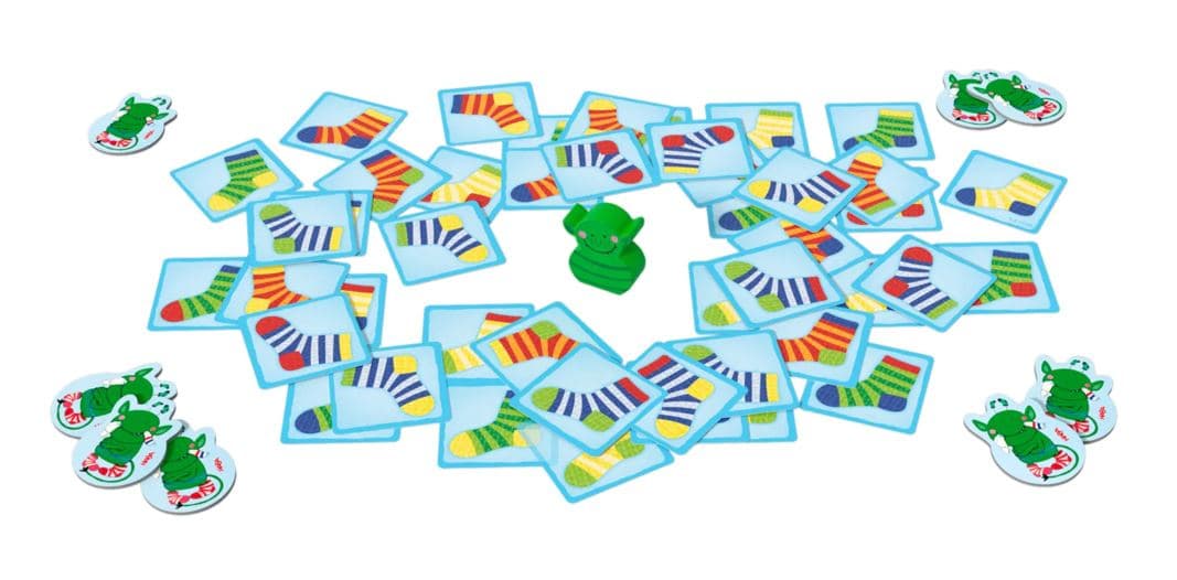 Karten wühlen, Paare schnappen!Oje, das Sockenmonster war im Kleiderschrank! Die Kinder müssen jetzt genau hinschauen und schnell die passenden Sockenpaare zusammenbringen. Wer am Ende die meisten Sockenmonster-Plättchen gesammelt hat, gewinnt.Inhalt:1 Sockenmonster, 8 Sockenmonster-Plättchen, 48 Sockenkarten (= 24 Sockenpaare), 1 Spielanleitung.- trainiert spielerisch die Wahrnehmung und das Reaktionsvermögen- ideal zum Mitnehmen oder Verschenken- mit Variante für geübte Socken-SpürnasenSpieldauer: 10 min