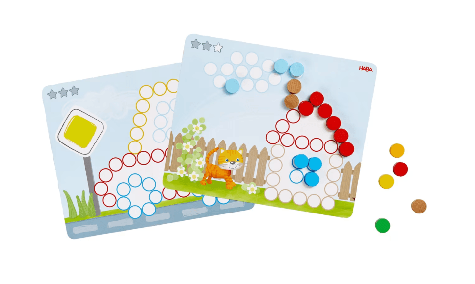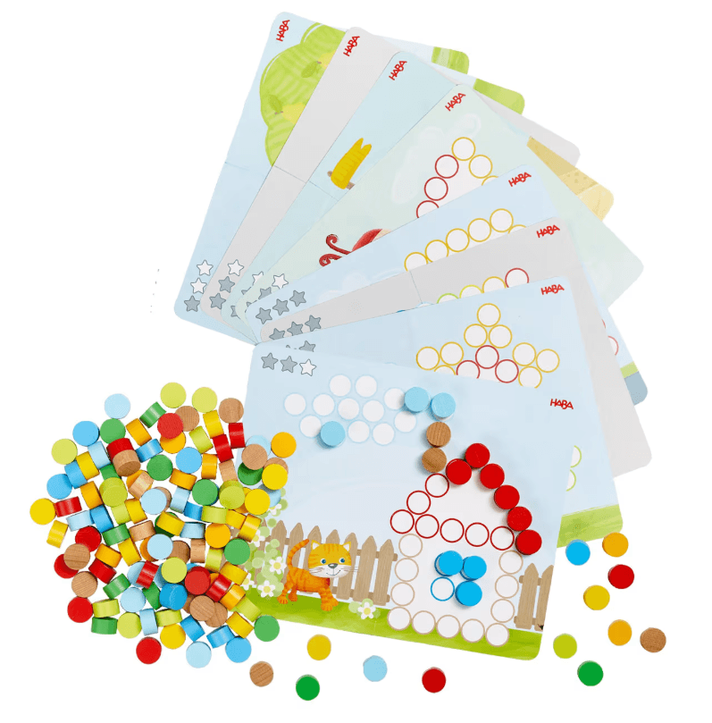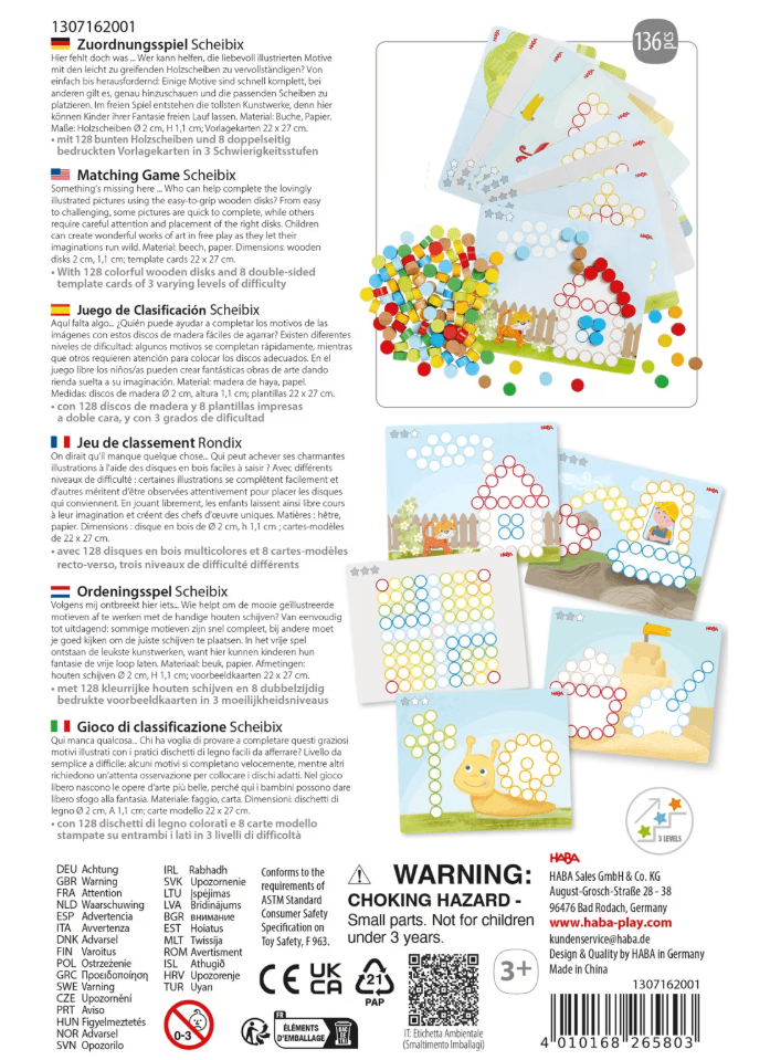 Hier fehlt doch was ... Wer kann helfen, die liebevoll illustrierten Motive mit den leicht zu greifenden Holzscheiben zu vervollständigen? Von einfach bis herausfordernd: Einige Motive auf den 8 beidseitig bedruckten und stabilen Vorlagenkarten sind schnell komplett, bei anderen gilt es, genau hinzuschauen und die passenden Scheiben zu platzieren. Im freien Spiel entstehen die tollsten Kunstwerke, denn hier können Kinder ihrer Fantasie freien Lauf lassen. Zum Vergleich:Holzscheiben Ø 2 cm, H 1,1 cm.