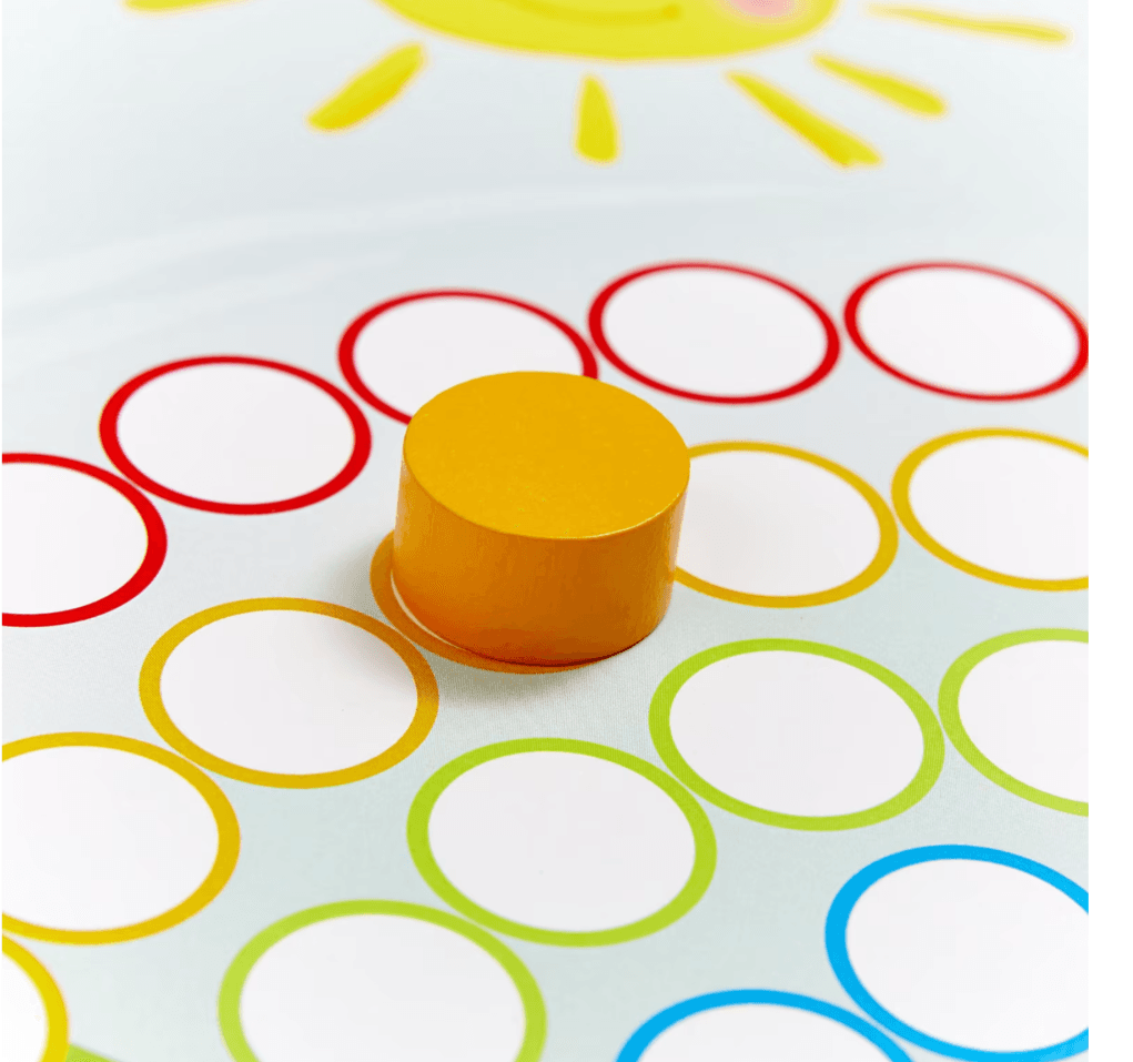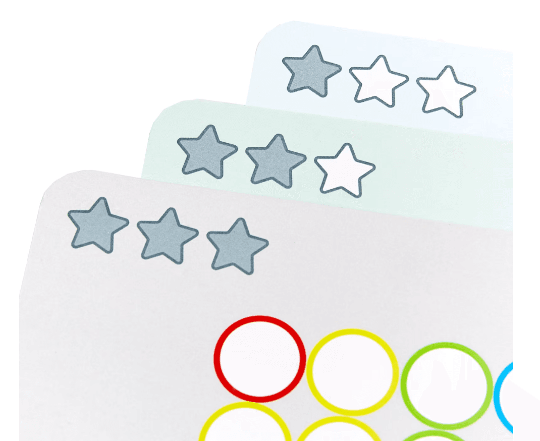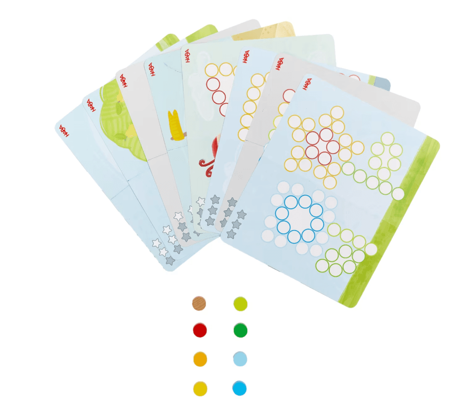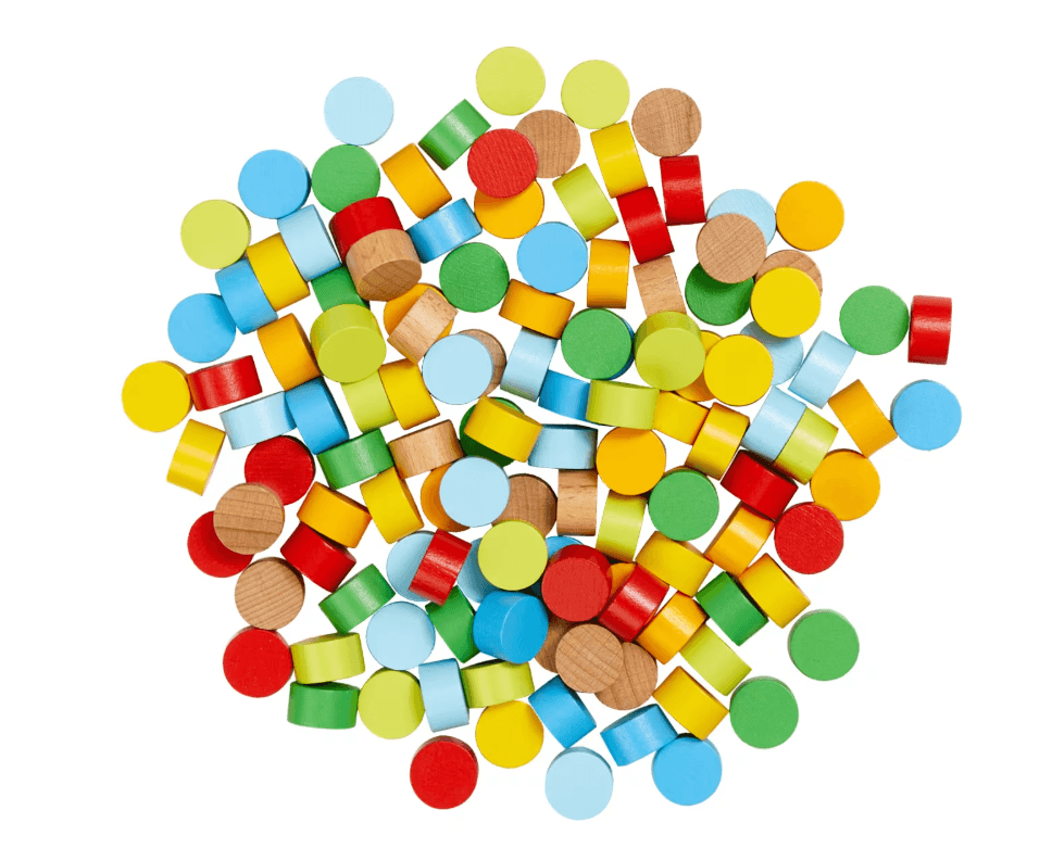 128 bunten Holzscheiben, 8 beidseitig bedruckte Vorlagekarten.