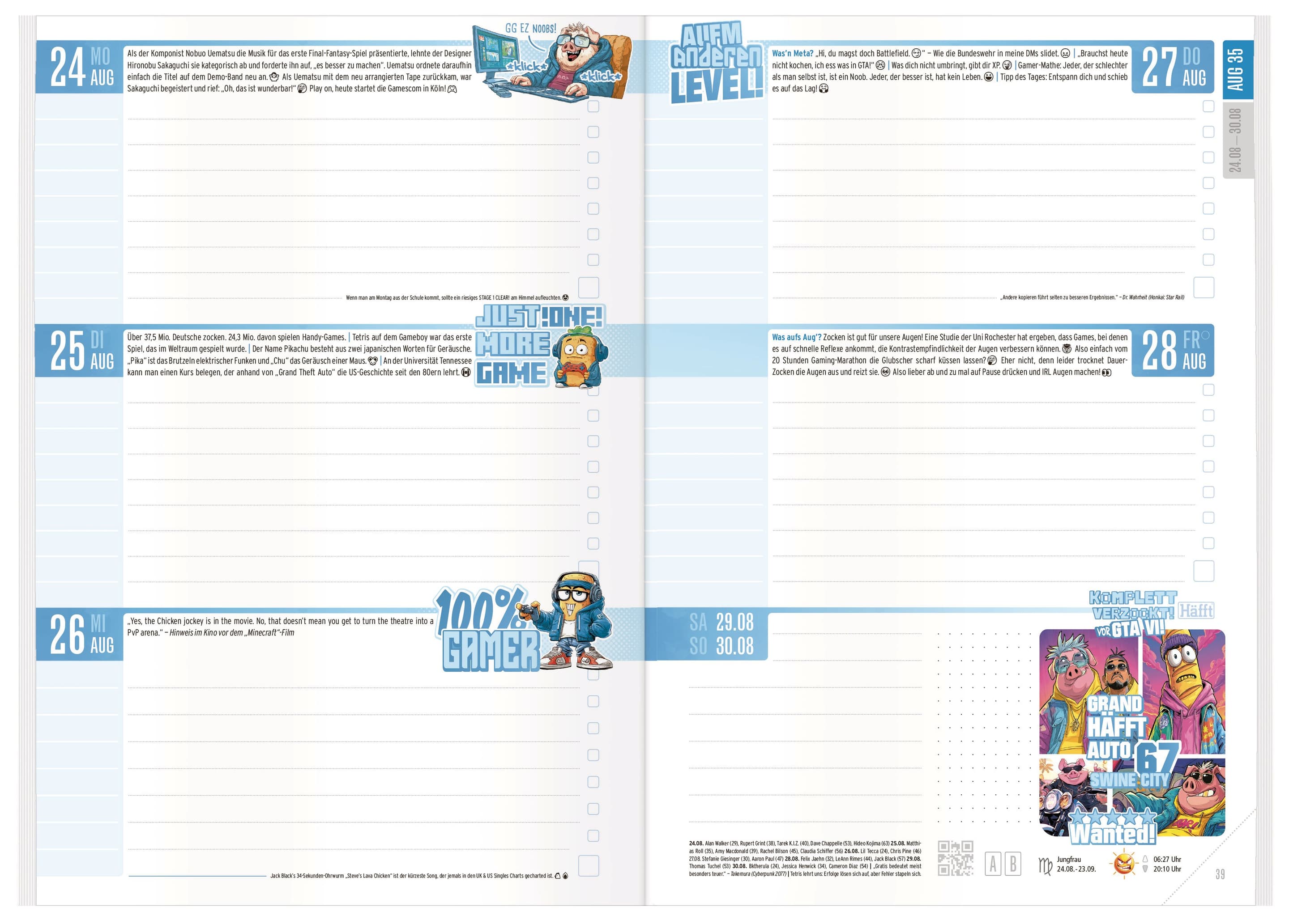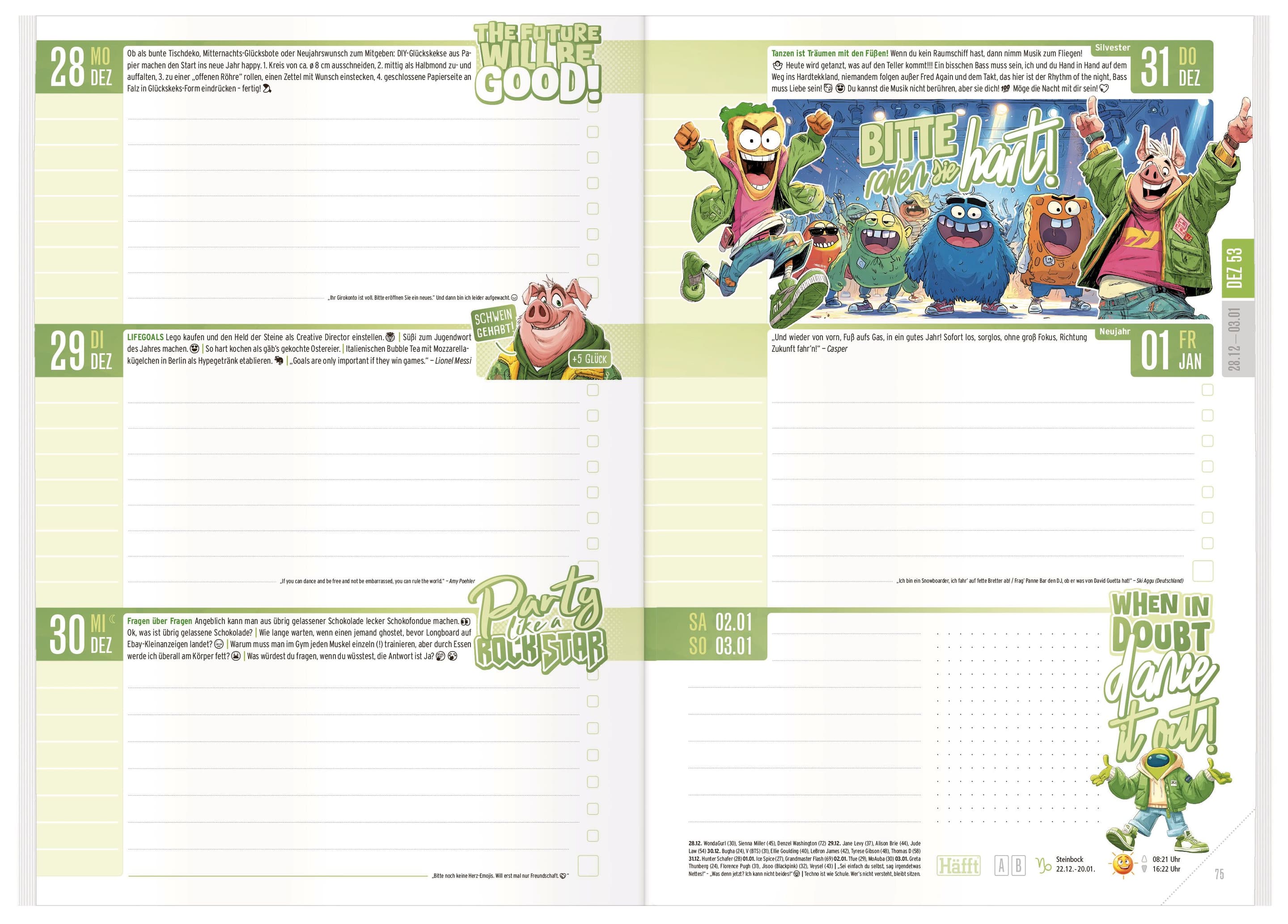 Kultiges Hausaufgabenheft für das Schuljahr 26/27, mit zahlreichen praktischen Sonderseiten und einer Extraportion Spaß, Hilfen zum Organisieren, Schulwissen, Infos und Übersichten, dazu Gags und Cartoons, Sprüche, Fun Facts und witzige Stories, Format A5, 176 Seiten, Klebebroschur, wasserabweisender Umschlag, mit Stickern.