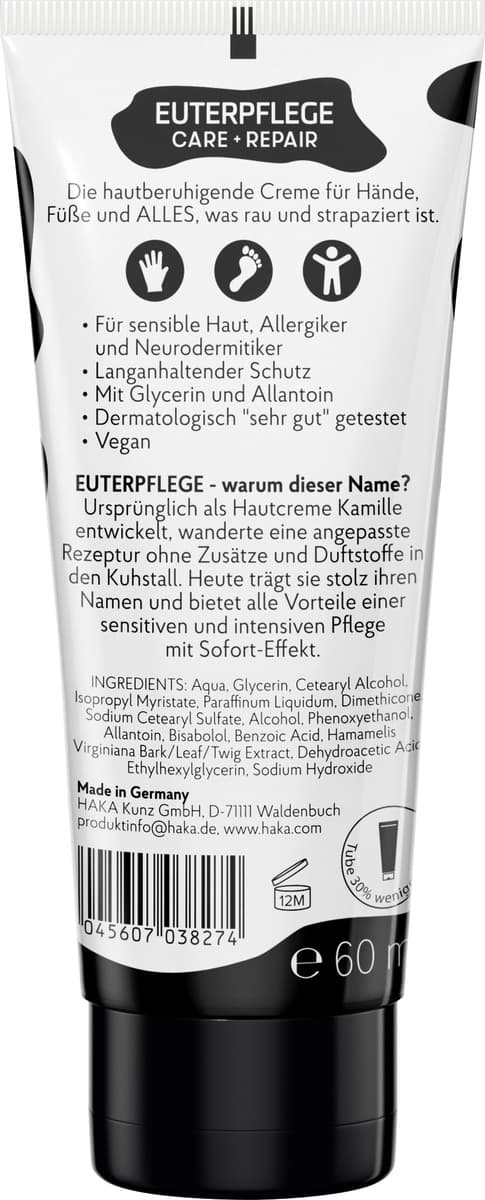 Ursprünglich als Hautcreme entwickelt, wanderte sie zur Euterpflege– nur ohne Duftstoffe– in den Kuhstall. Euterpflege? Was ein kuhler Name. Ab damit auf die Tube und zurück ins Bad als EUTERPFLEGE Creme. Der Gamechanger für trockene Haut, Neurodermitiker:innen und Allergiker:innen. Dermatologisch mit„sehr gut“​ bestätigt. Schon nach dem ersten Auftragen spürt man die wohltuende Wirkung der EUTERPFLEGE Creme. Die Haut wird sofort geschmeidiger und das Spannungsgefühl reduziert.