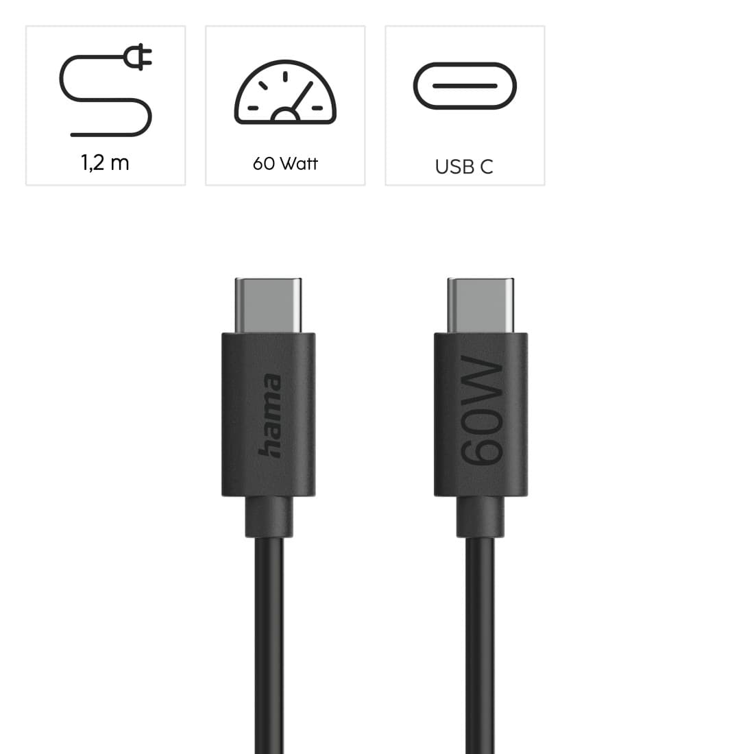HAMA Ladekabel, USB-C - USB-C, 60 W, 1,2 m, Schwarz