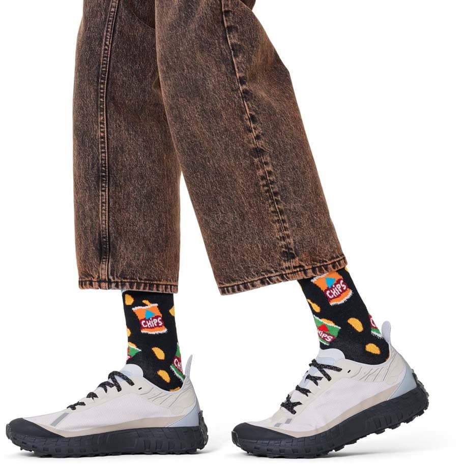 Knuspere dich in den Stil mit unseren schwarzen, lustigen Socken, die ein wiederholendes Muster einer Chipstüte zeigen und deinem Alltagsoutfit einen leckeren Twist verleihen.
