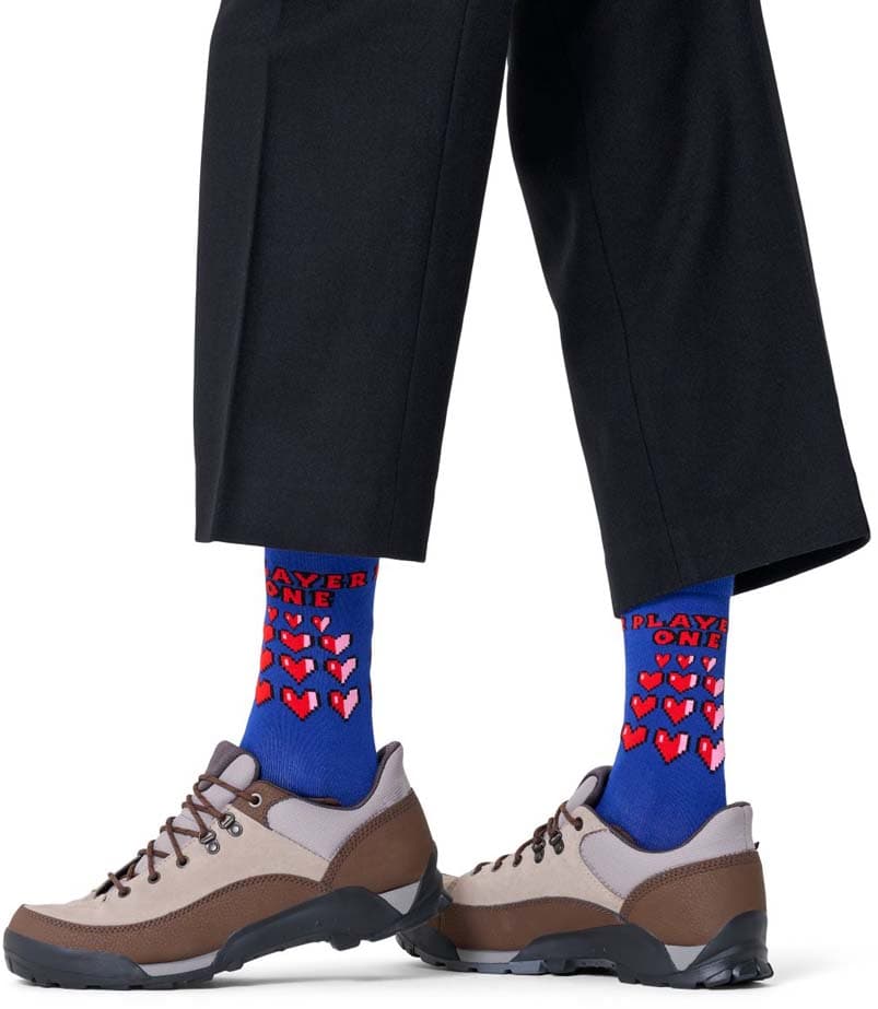 Pimpe dein Sockenspiel mit unseren blauen Gaming-Socken auf, die ein verpixeltes Herzmuster und den Schriftzug "Player One" zeigen. Bestelle jetzt und zeig deine lustige Seite.