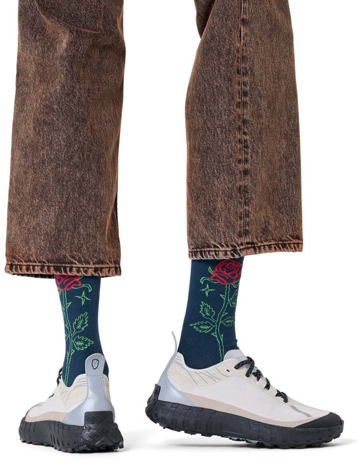 Dieses mutige, auffällige Design ist nichts für schwache Nerven und feiert die Schönheit der Unvollkommenheit mit seinem unverblümten Rosenmuster inklusive Dornen. Die Socke besteht aus einer Mischung aus Bio-Baumwolle und recyceltem Polyester und hat eine verstärkte Ferse und Spitze, damit sie länger hält.