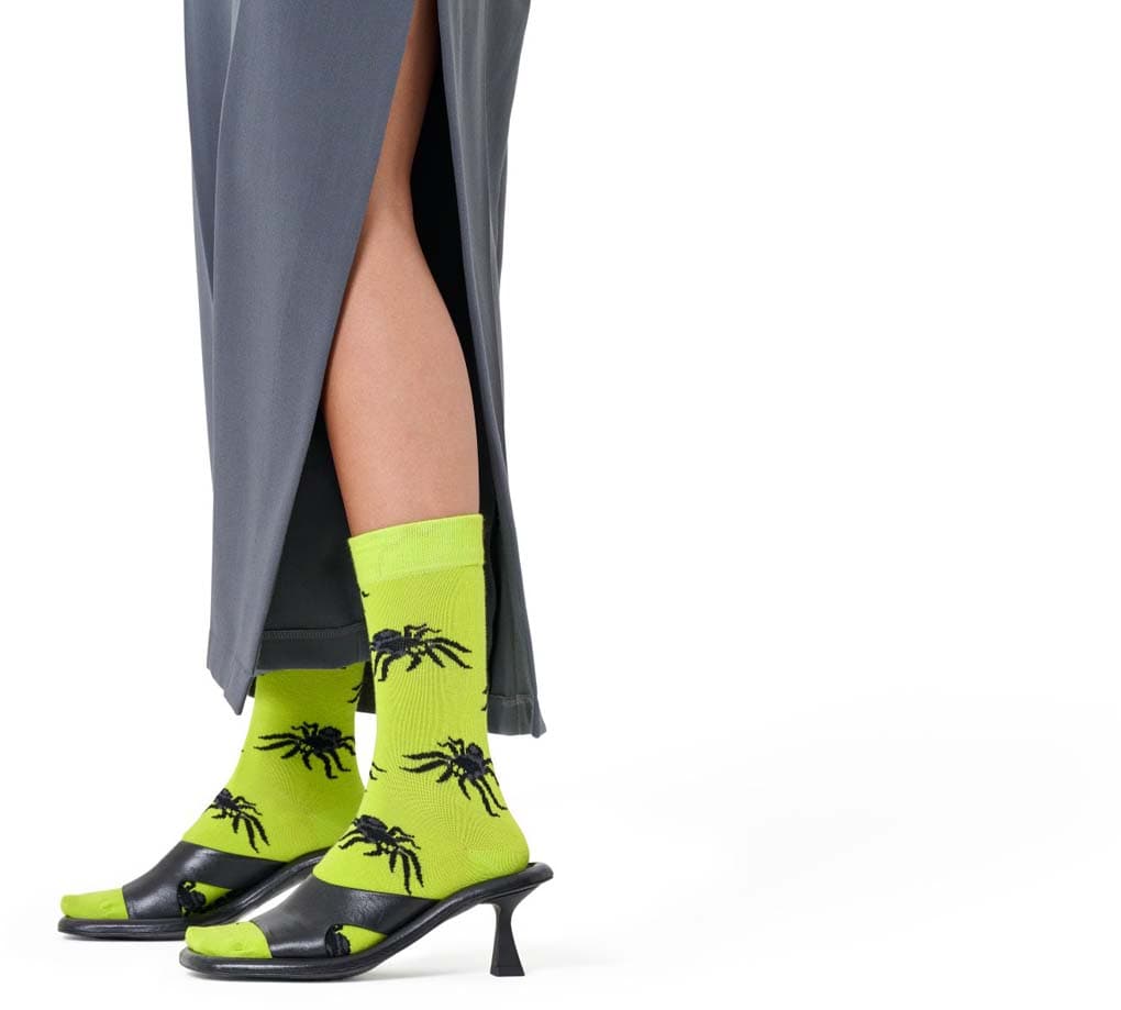 Verspielte Spinnensocken mit einem sich wiederholenden Spinnenmuster auf leuchtend gelbem Hintergrund. Shoppe jetzt und bring gruselig-krabbelnden Spaß in dein Outfit.