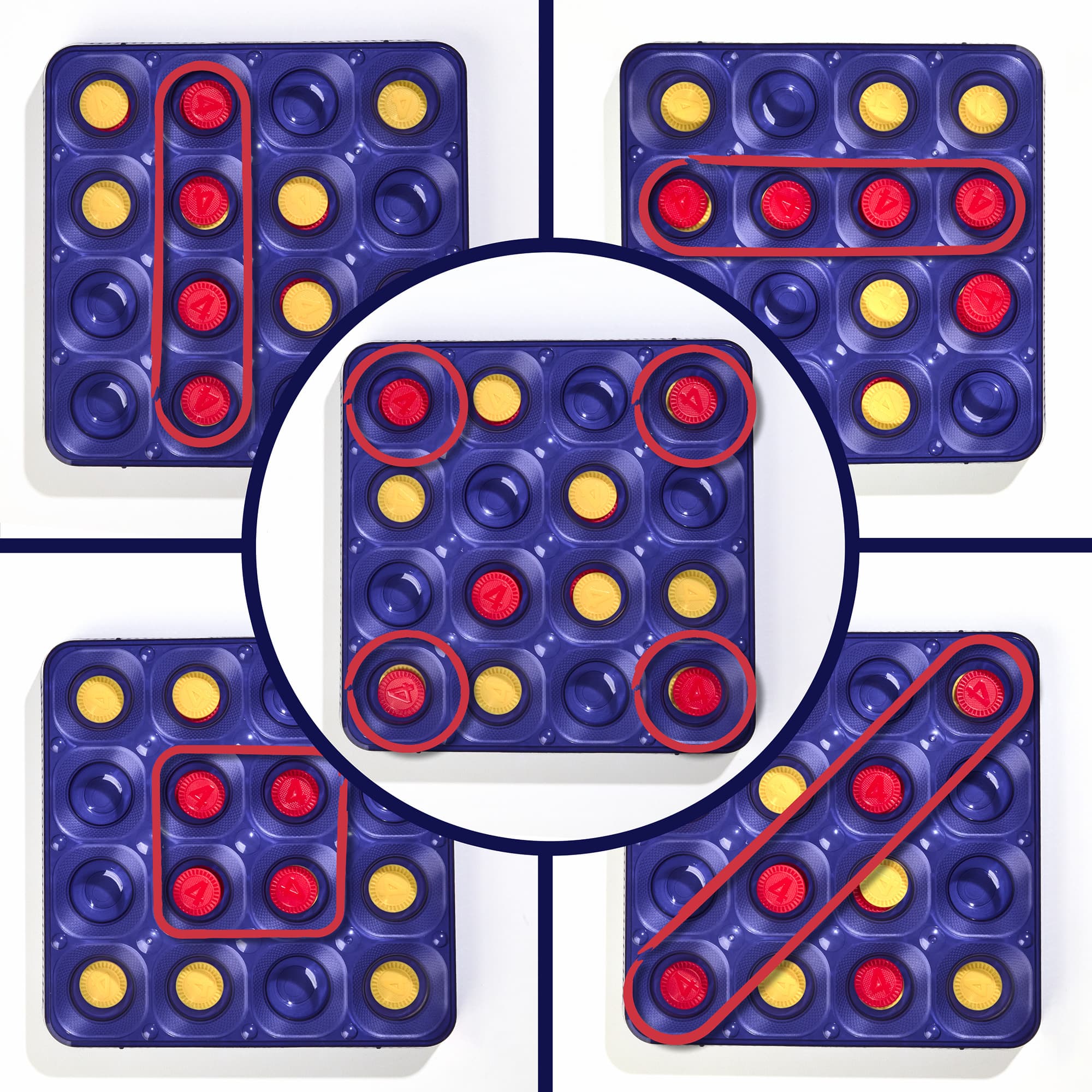 SCHEIBEN SPRINGEN, UM 4 IN EINE REIHE ZU BRINGEN: Hier spielt Team Rot gegen Team Gelb! Die Spieler lassen die 4-gewinnt-Scheiben von einem Tisch oder einer anderen flachen, harten Oberfläche in das Raster hüpfen! Um zu gewinnen, gilt es, Scheiben zu versenken, Felder wegzuschnappen und 4 in einer R