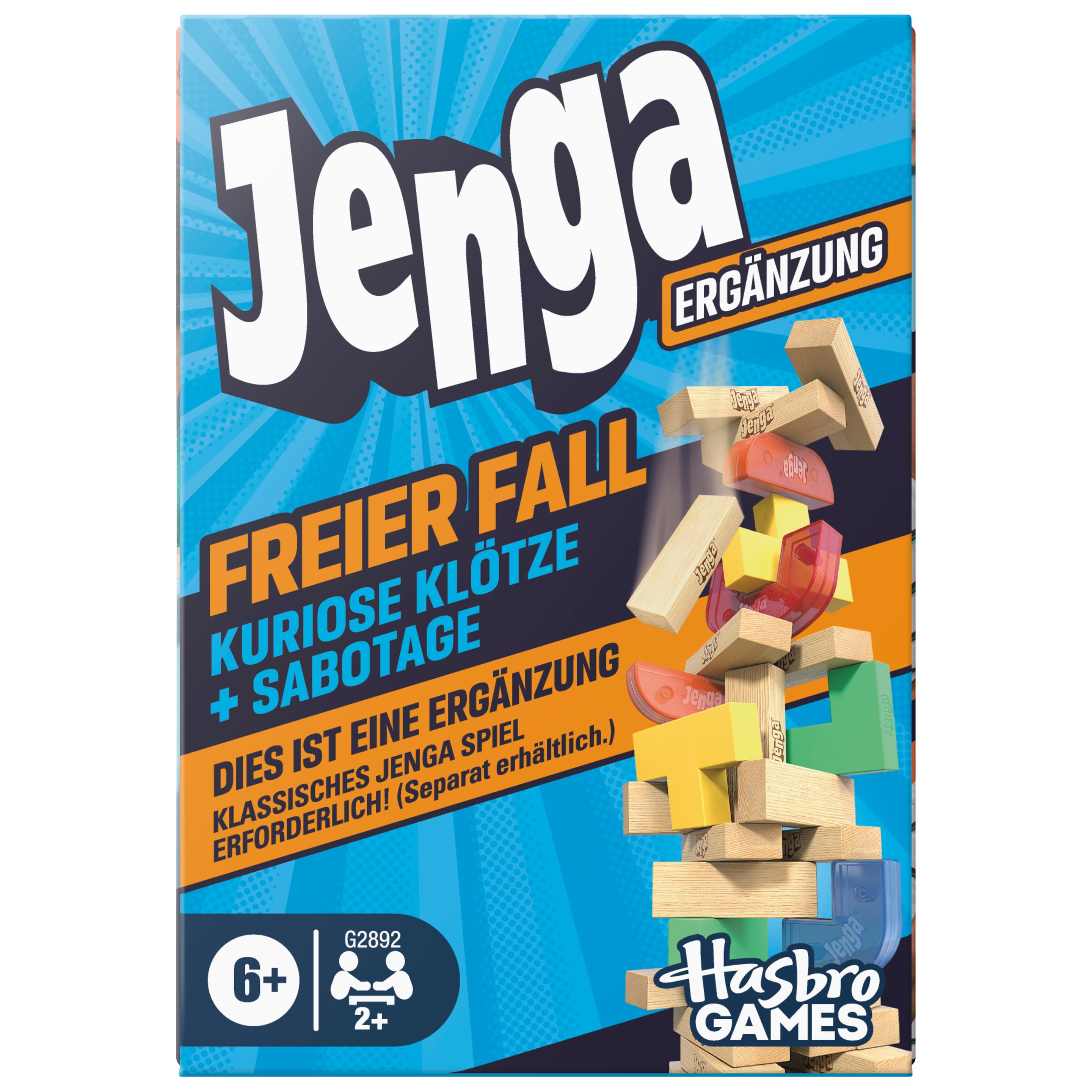 JENGA ERGÄNZUNGSPACK: Mit der Jenga Ergänzung „Freier Fall“ kommen kuriose Klötze ins Spiel und machen Jenga noch spannender und strategischer! (DIES IST EINE ERGÄNZUNG UND KEIN EIGENSTÄNDIGES SPIEL. JENGA SPIEL ERFORDERLICH. Separat erhältlich)