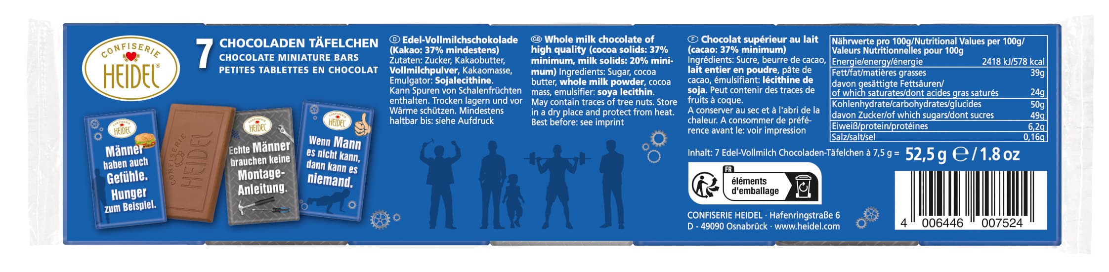 Typisch Mann! Die witzigen Heidel Männersprüche sind eine süße Geschenkidee für die Herren. Die leckeren Täfelchen bestehen aus bester Edelvollmilch Schokolade und sind mit lustigen, ironischen und liebevollen Sprüchen rund um den Mann bedruckt. So lässt sich für nahezu jeden Anlass eine kleine Tafel verschenken.