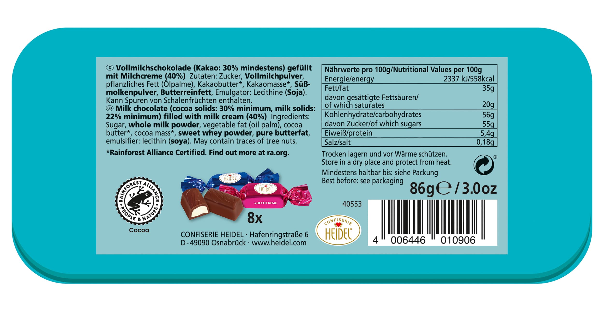 ZutatenZucker, VOLLMILCHPULVER, pflanzliches Fett (Ölpalme), Kakaobutter, Kakaomasse, SÜßMOLKENPULVER, BUTTERREINFETT, Emulgator: LECITHINE (SOJA)