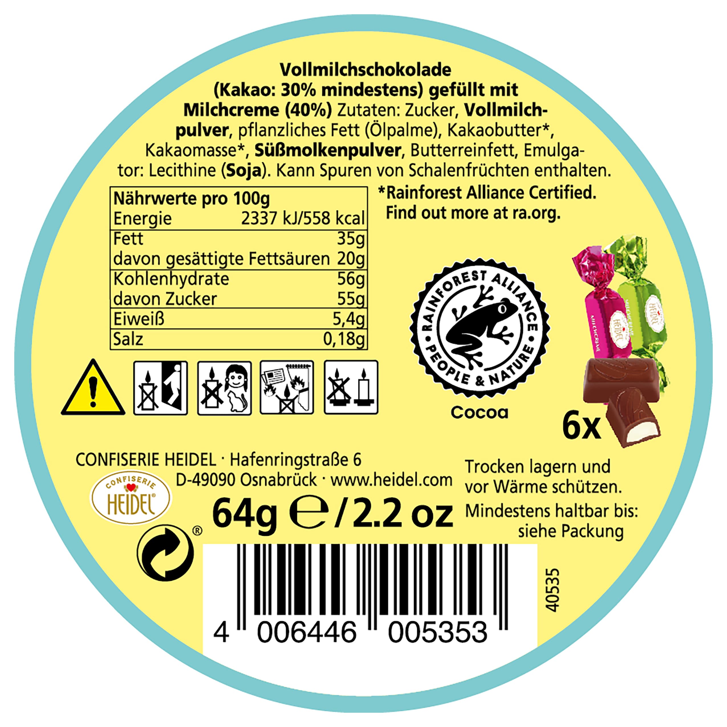 | Zutaten | Zucker, VOLLMILCHPULVER, pflanzliches Fett (Ölpalme), Kakaobutter, Kakaomasse, SÜßMOLKENPULVER, BUTTERREINFETT, Emulgator: LECITHINE (SOJA) |