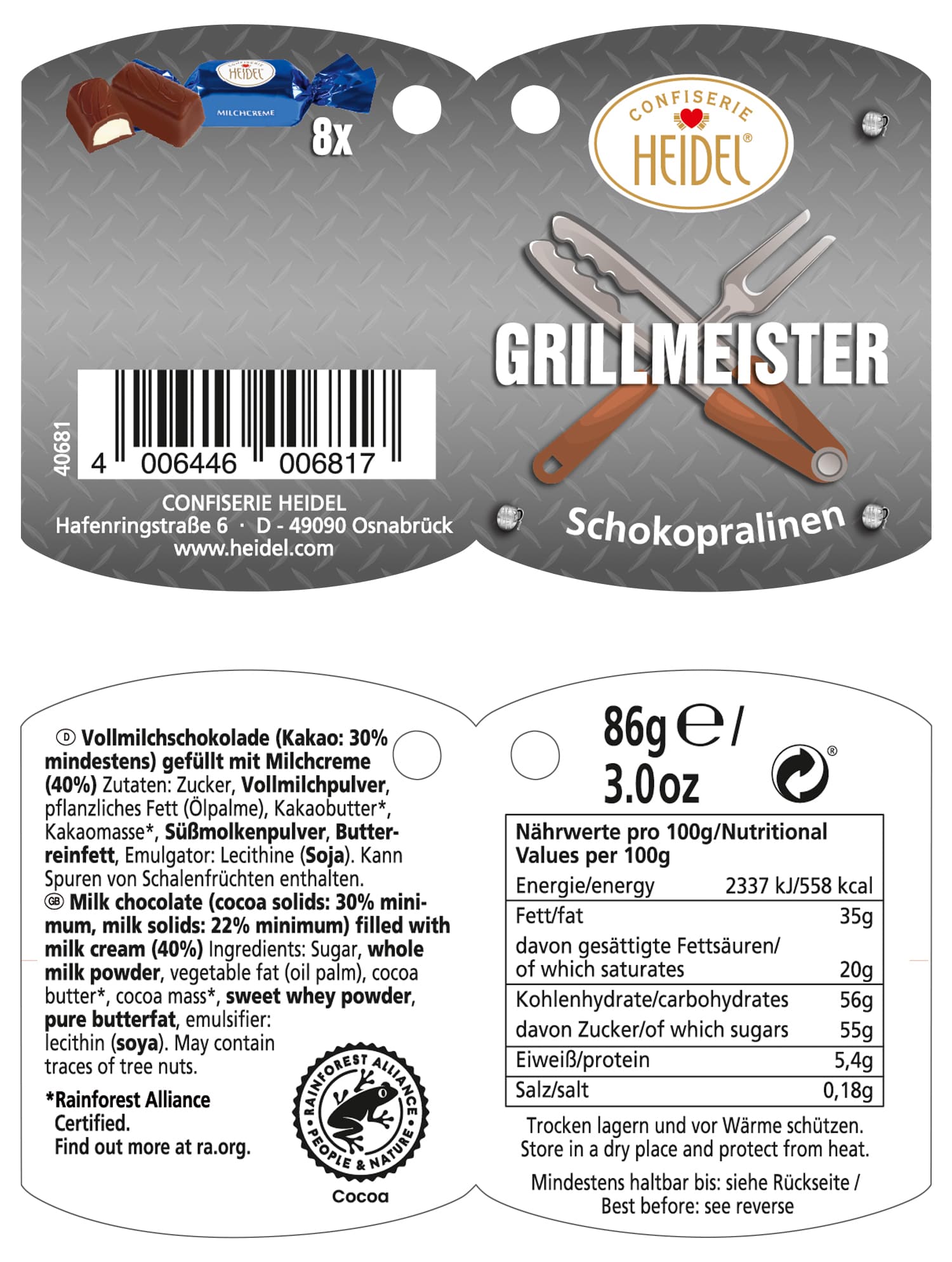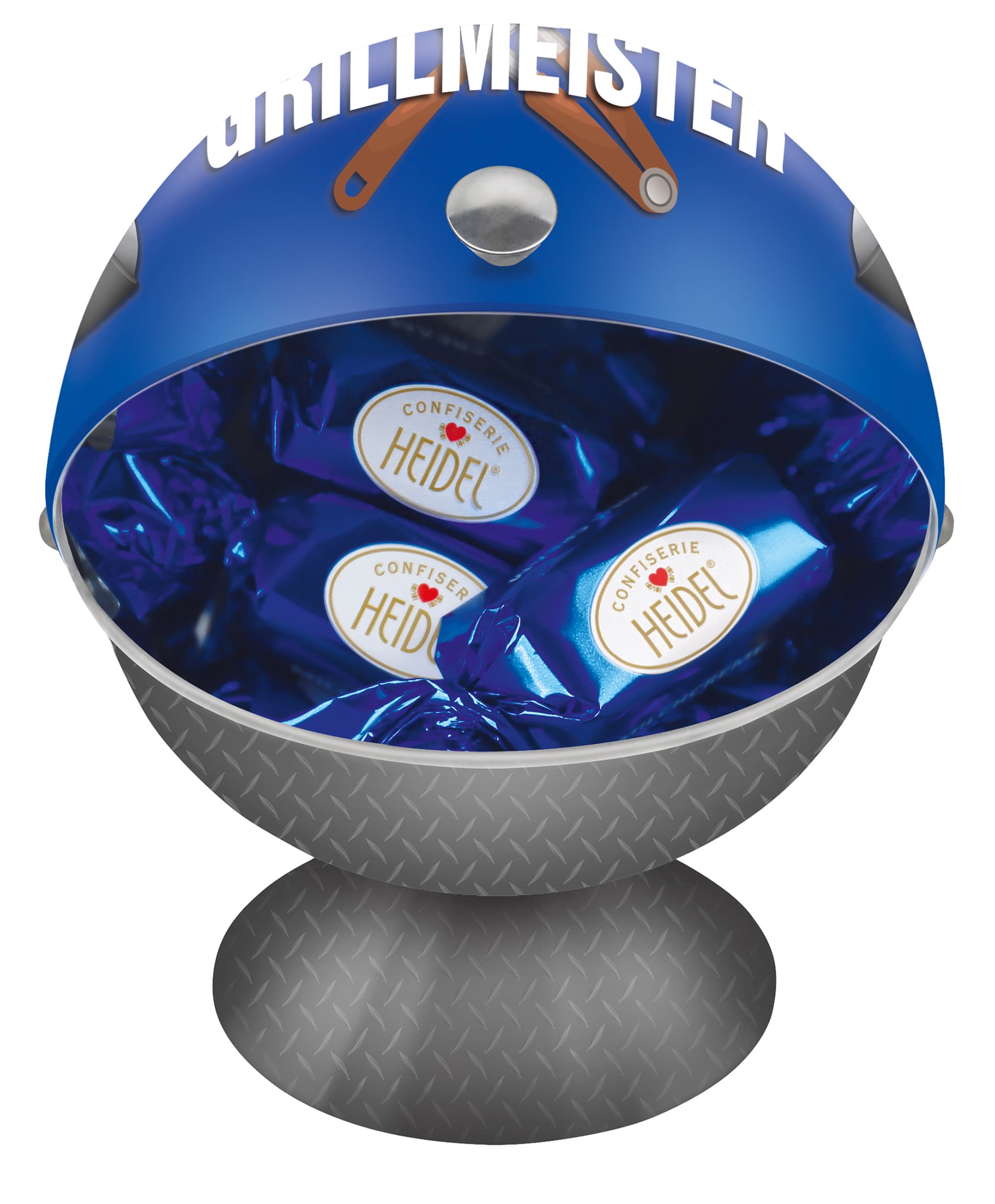 Mit dem Heidel Grillmeister wird die Grillsaison zu einem süßen Fest! Die detailreich gestaltete Metalldose in Form eines kleinen Grills ist bei jeder Grillparty ein echter Blickfang. Gefüllt mit köstlichen Pralinen aus zarter Vollmilchschokolade und feiner Milchcremefüllung, sorgt sie für genussvolle Momente. Der Deckel lässt sich wie bei einem echten Grill ganz einfach nach hinten schieben – für noch mehr Spaß beim Naschen!