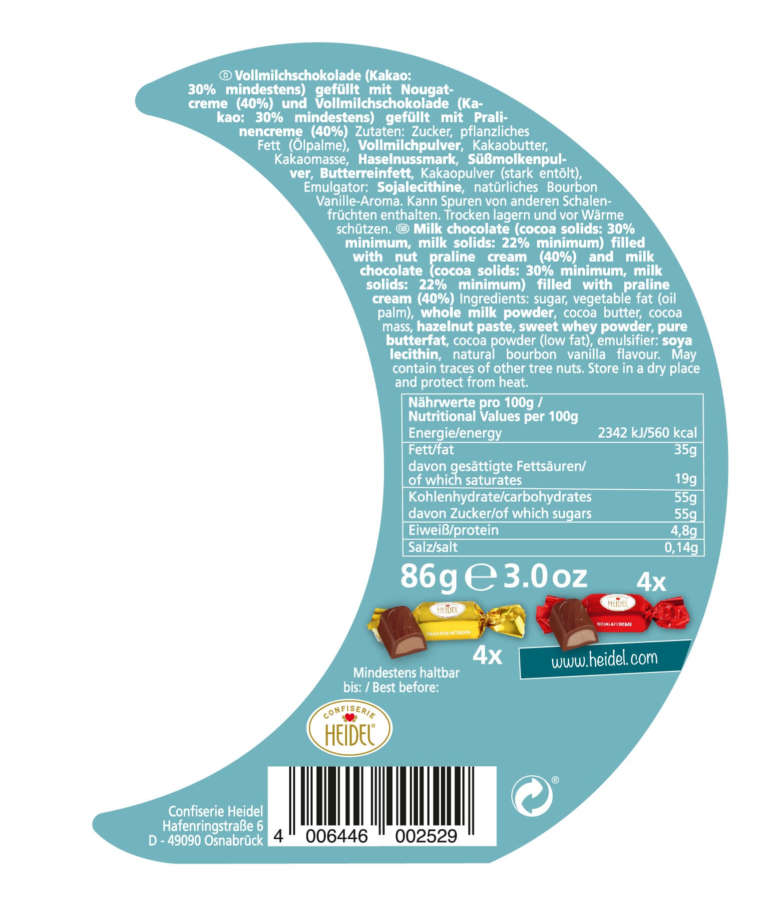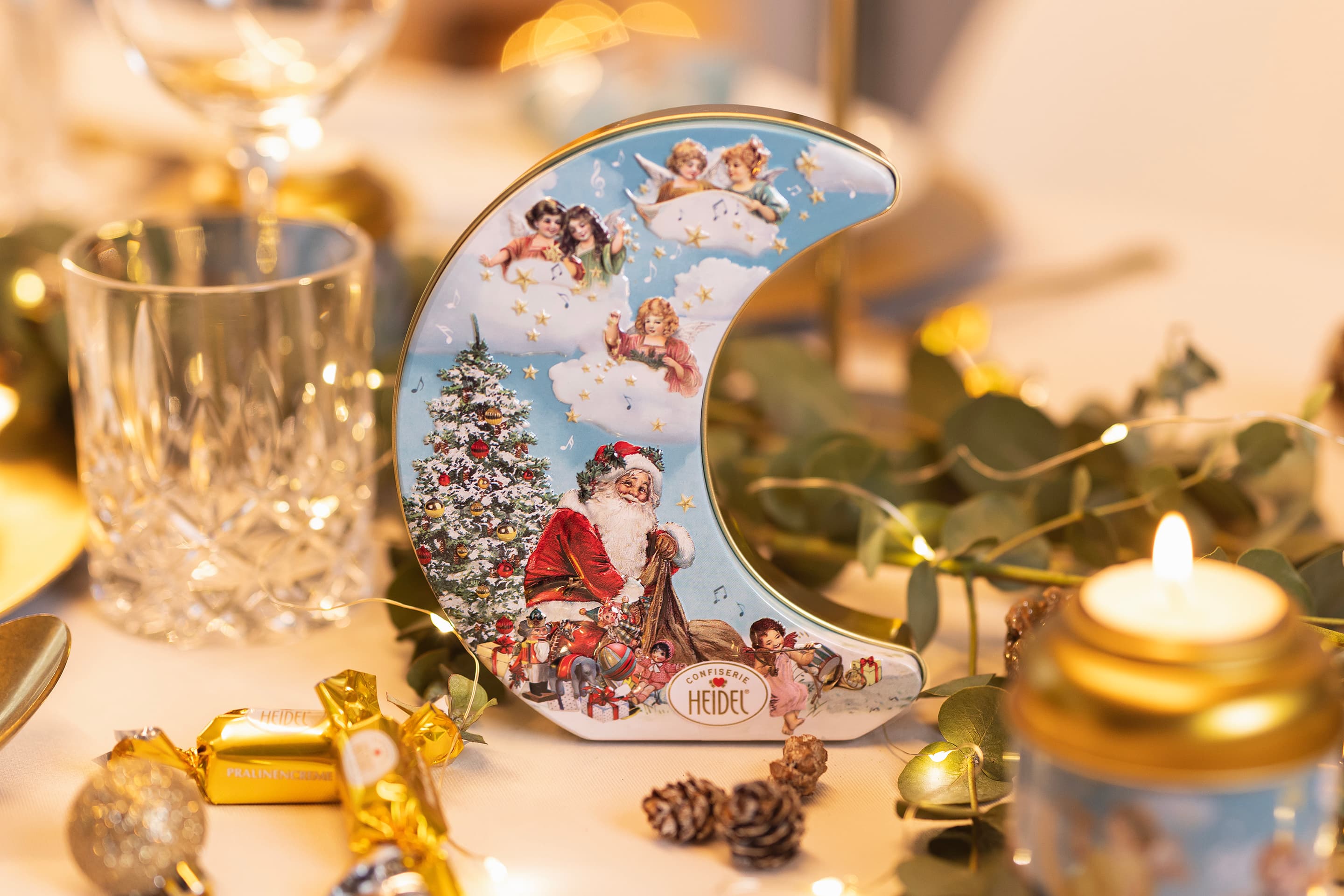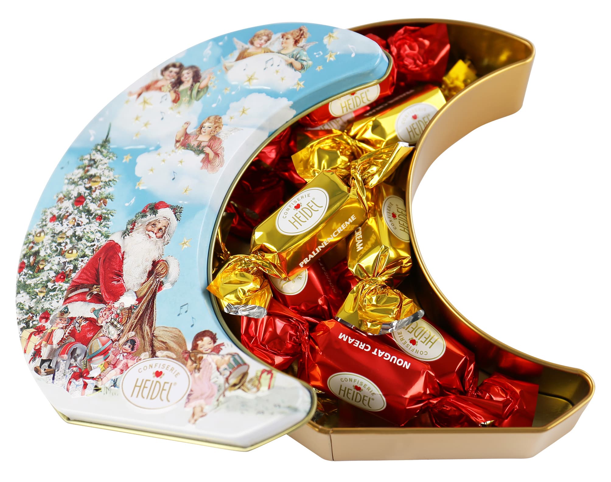 Diese hochwertige Metalldose in Form einer zarten Mondsichel ist ein echter Blickfang und versprüht mit ihrer liebevollen Engel-Illustration nostalgischen Weihnachtszauber. Die besondere Form und das detailreiche Design machen sie zu einer himmlischen Geschenkidee, die sofort festliche Stimmung aufkommen lässt. Im Inneren warten köstliche Schokopralinen mit feiner Pralinen- und Nougatcremefüllung darauf, entdeckt zu werden. Jeder Bissen ist ein cremiger Genussmoment, der die besinnliche Jahreszeit auf besonders süße Weise begleitet. Ob als dekoratives Mitbringsel, kleines Geschenk oder persönliche Freude – diese nostalgische Mondsichel vereint traditionelle Weihnachtsromantik mit edlem Schokoladengenuss.