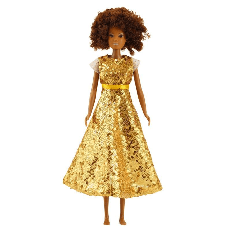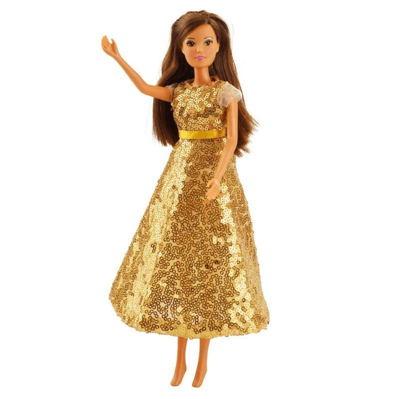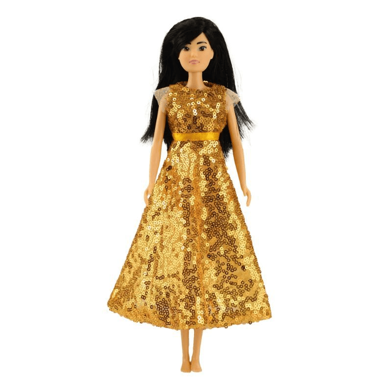 Glanz und Glamour für den großen Auftritt! Mit dem Heless Time2Shine Paillettenkleid „Goldstar“ wird jede Modepuppe zum Star des Abends. Das elegante Kleid ist vollständig mit funkelnden goldfarbenen Pailletten besetzt und sorgt für einen strahlenden Look bei jeder Puppenparty.